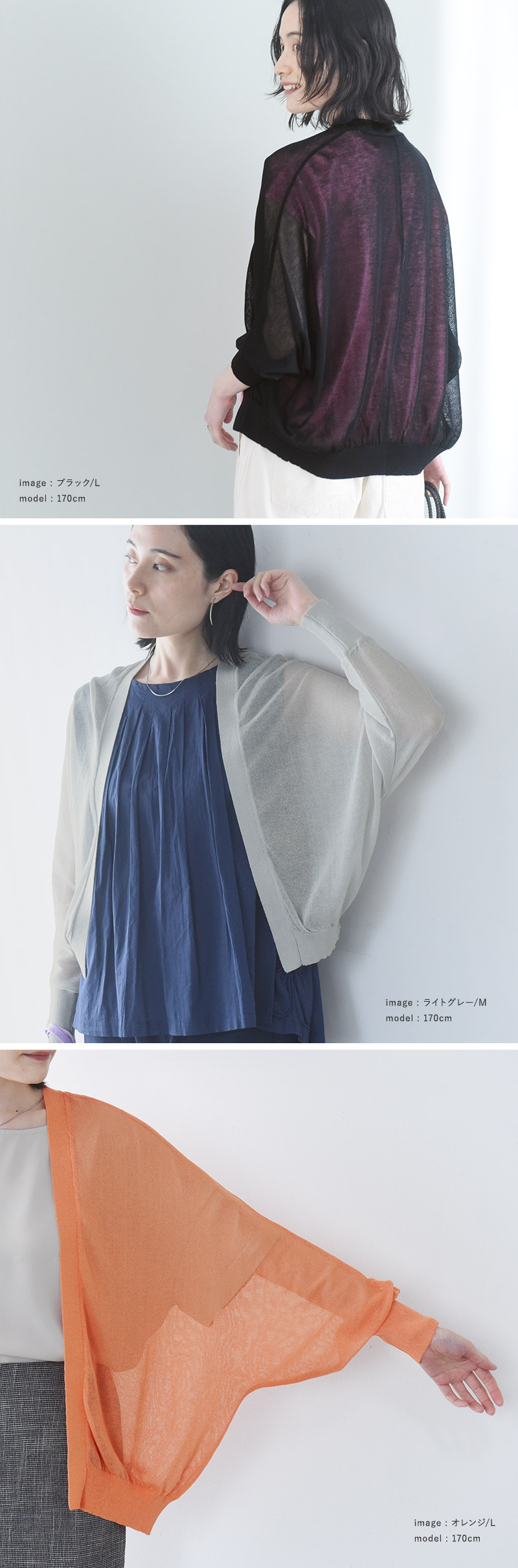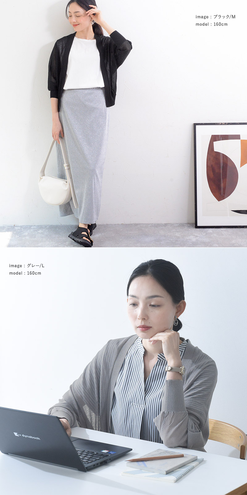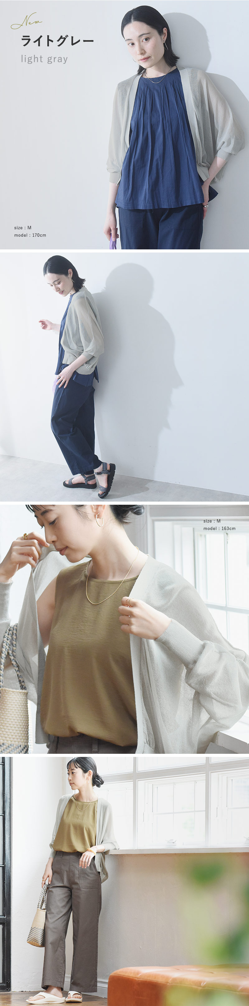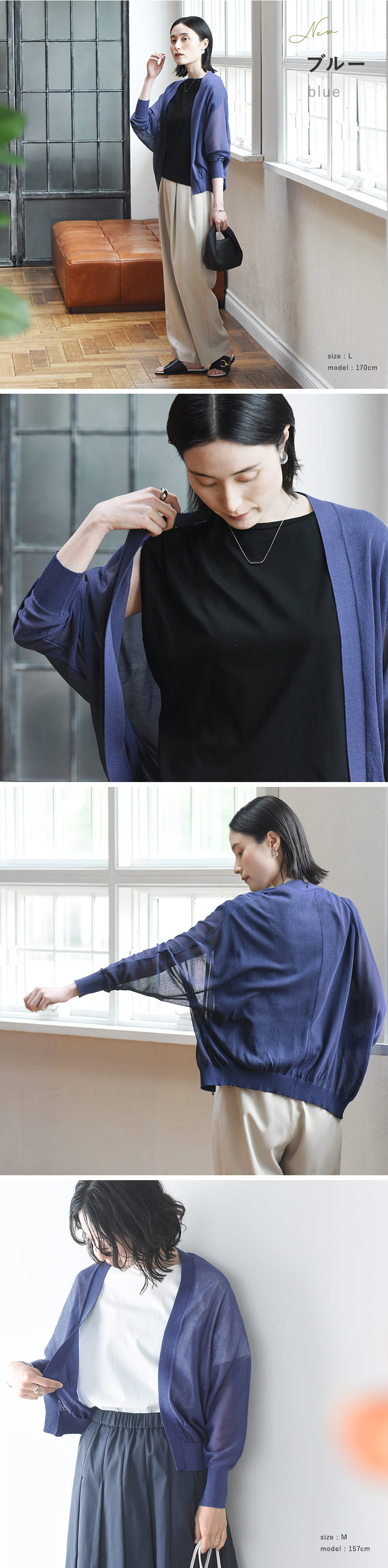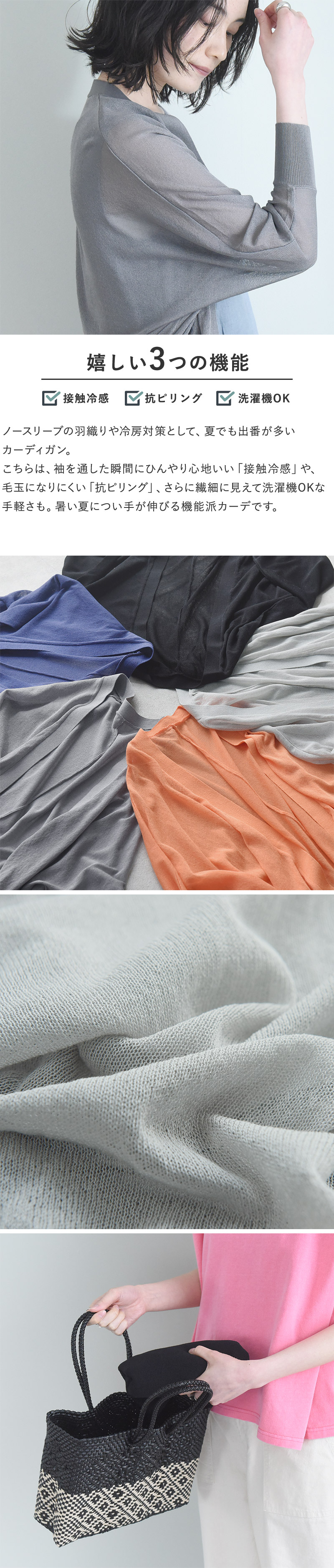 - 日差しや冷房対策に、夏も欠かせないシアーカーディガン。こちらは接触冷感機能付きで、快適で涼しい着心地。ネットに入れて洗濯機で丸洗いできるのも◎です。