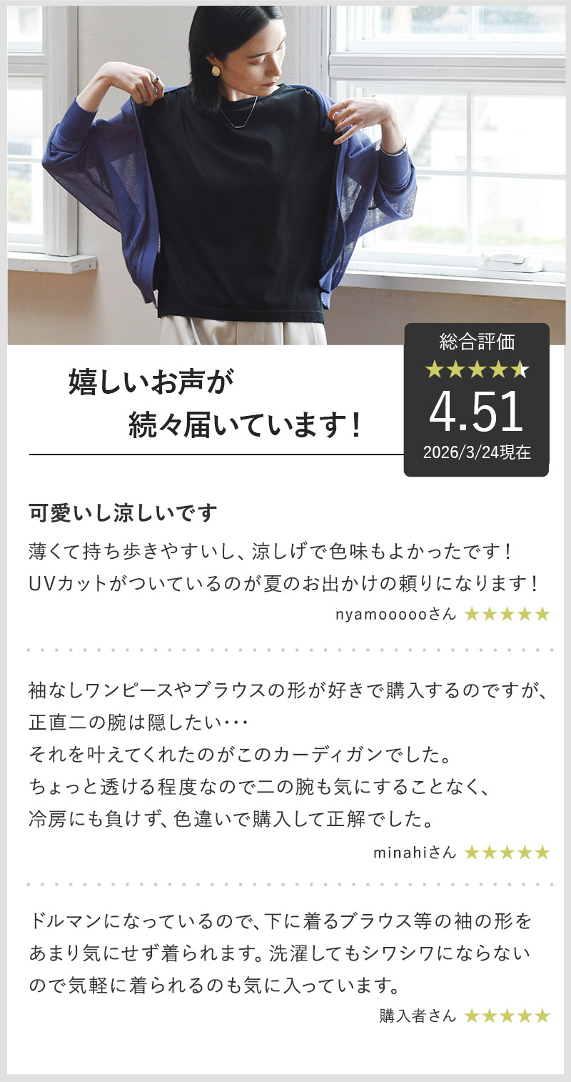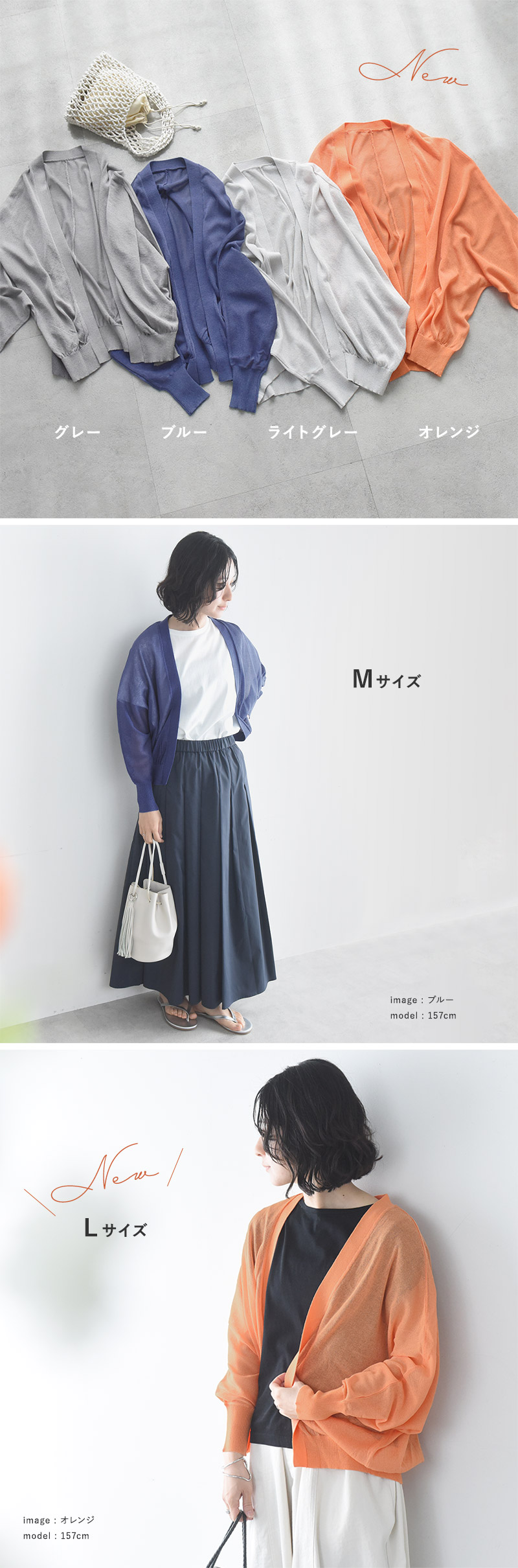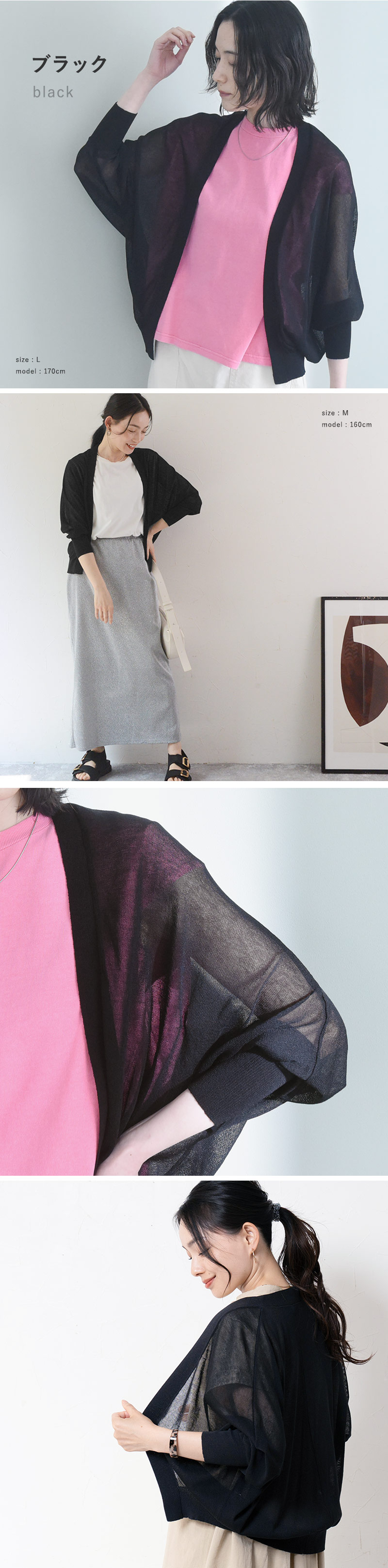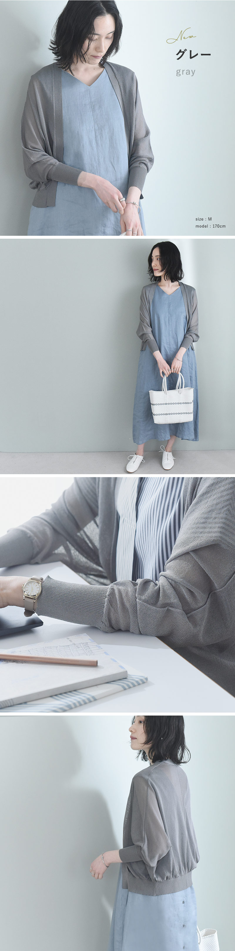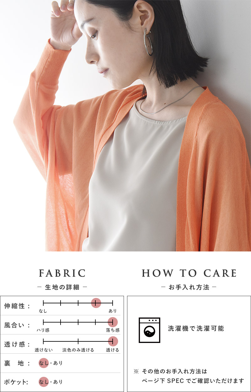 - 日差しや冷房対策に、夏も欠かせないシアーカーディガン。こちらは接触冷感機能付きで、快適で涼しい着心地。ネットに入れて洗濯機で丸洗いできるのも◎です。