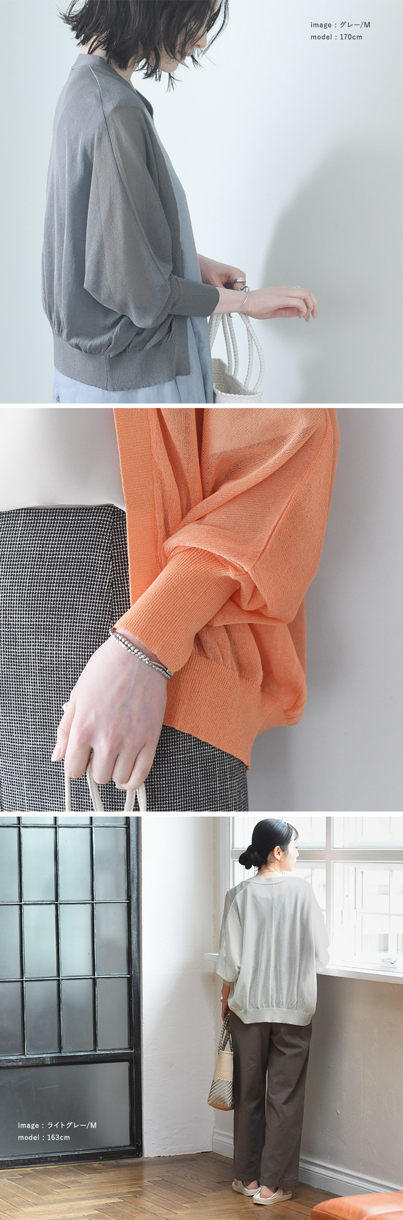 ドルマンスリーブのリラックスした雰囲気、オンオフ合わせやすいデザインも魅力。透け感のある軽やか素材感が夏スタイルを盛り上げてくれます。