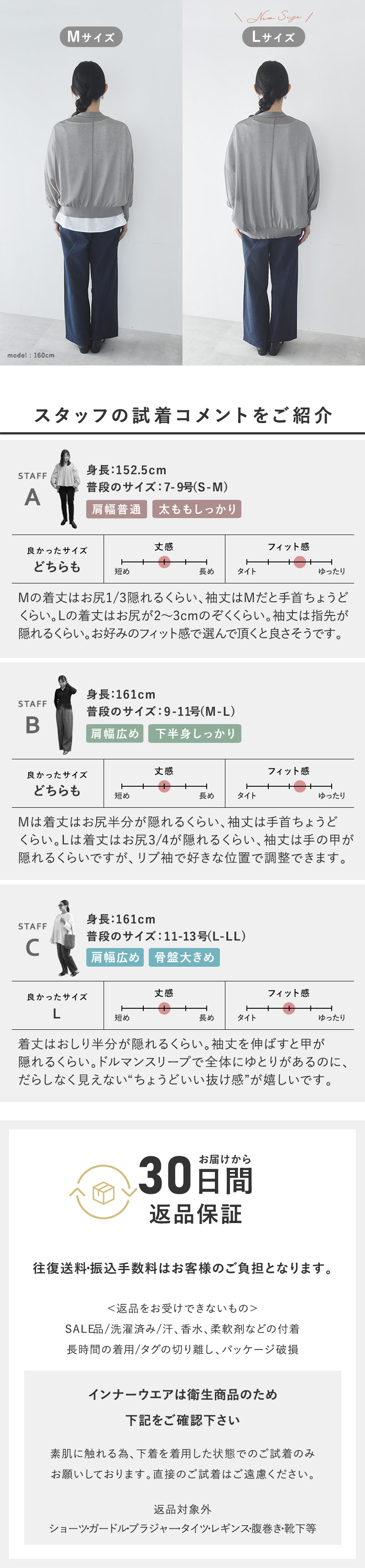 気になる部分を、そっと目隠し身頃と袖に切替がないドルマンスリーブは、フレンチスリーブや半袖Tシャツの上にも羽織りやすいゆったりシルエット。