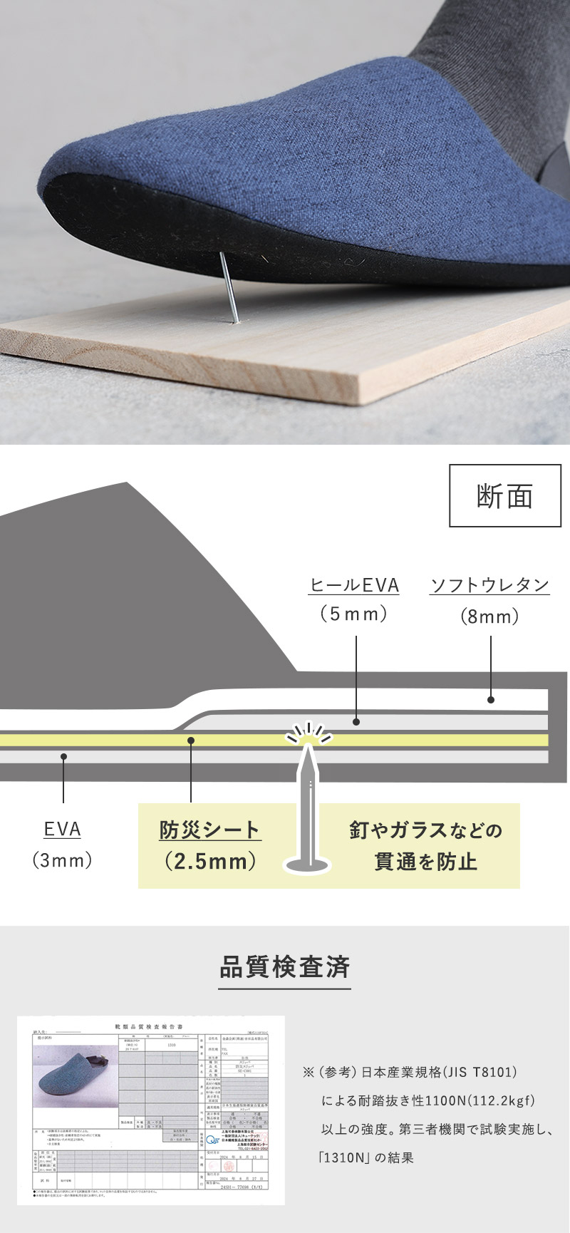 第三者機関の踏み抜き防止の検査にも合格した防災スリッパです。※