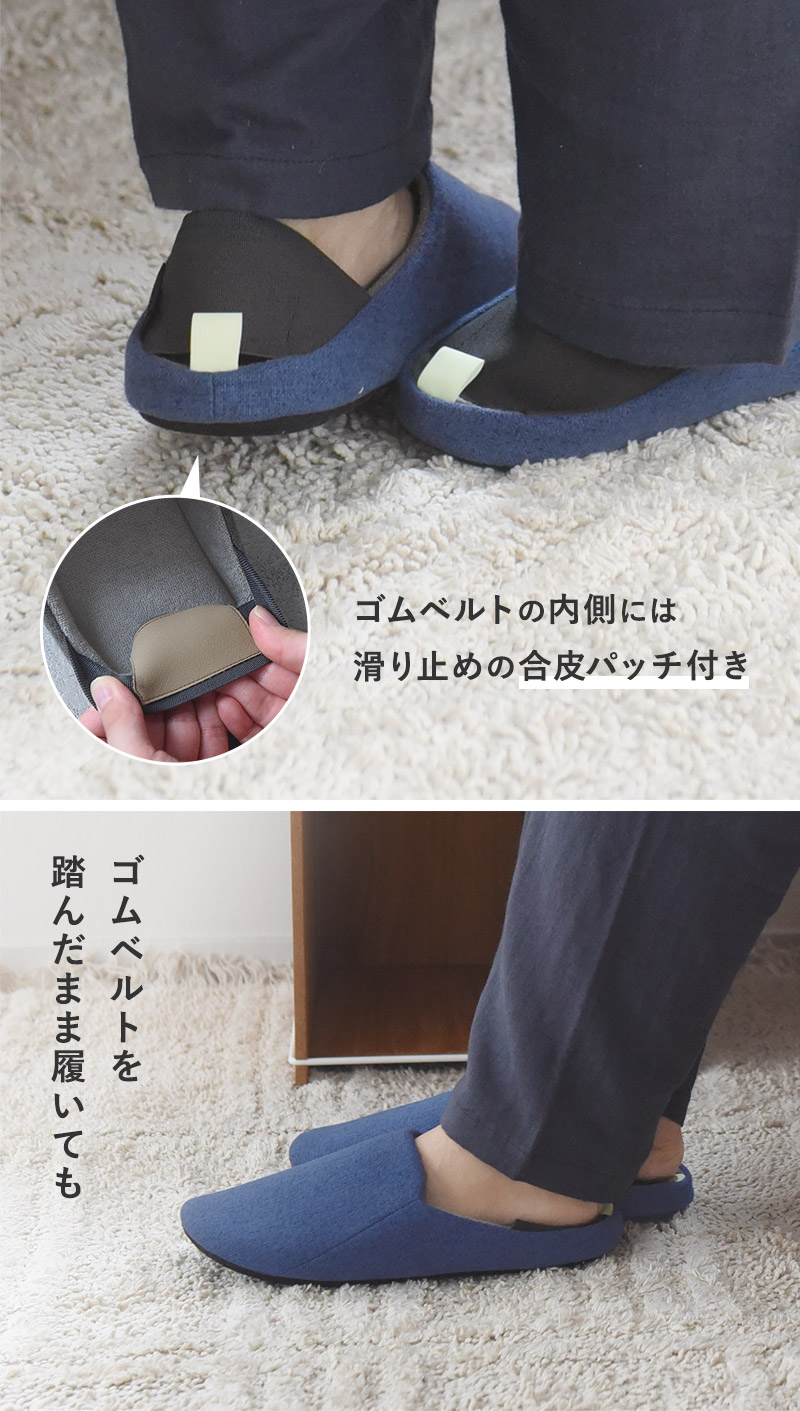 ゴムベルト付きで脱げにくいかかとにはゴムベルトが付いており、脱げにくいのもポイント。ゴムベルトの裏側に合皮パッチが縫い付けてあり、滑りにくい仕様になっています。インソールに綺麗に収まるので、普段履くときは、踏んだまま履いてもOK。