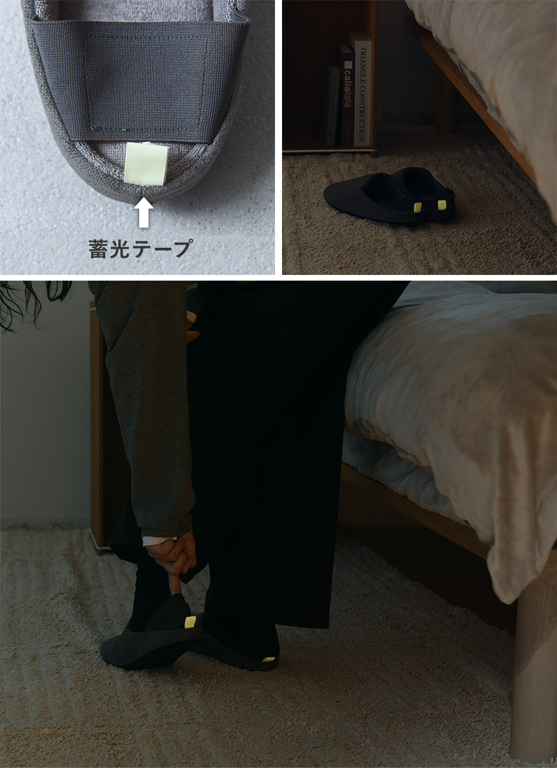 暗いところでも、ぱっと見つかるかかと部分に蓄光テープを付けており、夜暗い部屋でもスリッパがどこにあるか分かりやすいようにしました。20分間光を当てることで約6時間発光、非常用・防災用としても推奨される、JCクラス以上の「高輝度タイプ」に該当するテープです。
