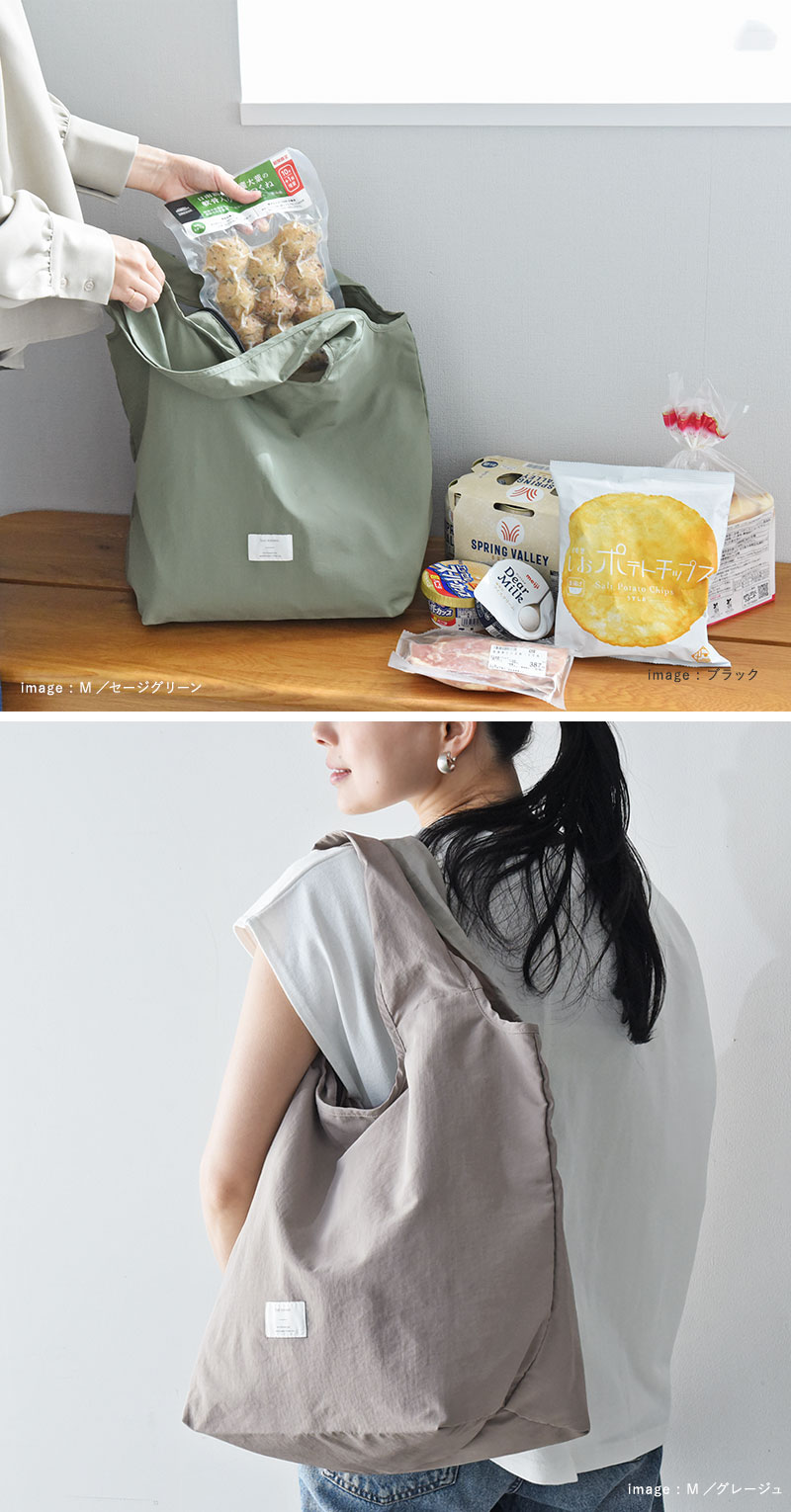 Mサイズは自転車のカゴにスッポリ入るサイズ感で、夕飯の買い出しにも◎。Sサイズはコンビニ弁当や、帰りがけにお肉や魚、アイスなどちょっと買い足したいシーンにぴったり。ありそうでなかった、理想のカタチのエコバッグです。