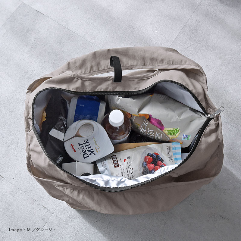 - マチの大きなエコバッグシリーズの保冷タイプ。薄手の生地だから軽くて持ち歩きやすく、冷気を逃がさないファスナー&保冷ポケット付きで夏場の食材の持ち歩きも安心です。