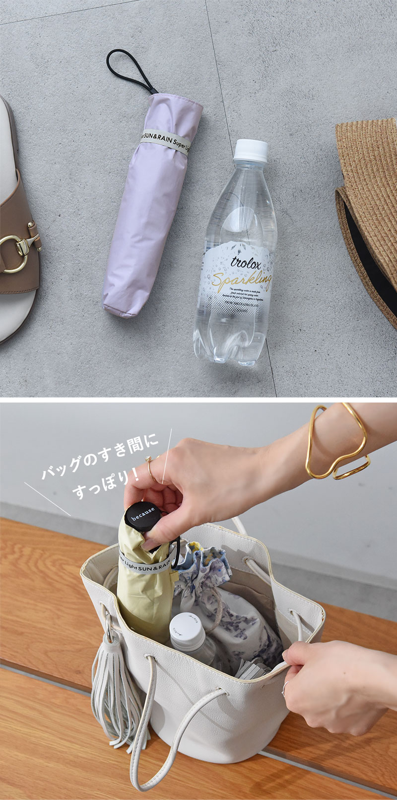 カバンに入れっぱなしでも一切ストレスなし。持ち歩いているのを忘れるくらい軽量で、バッグの隙間にすっと入るスリムな日傘です。
