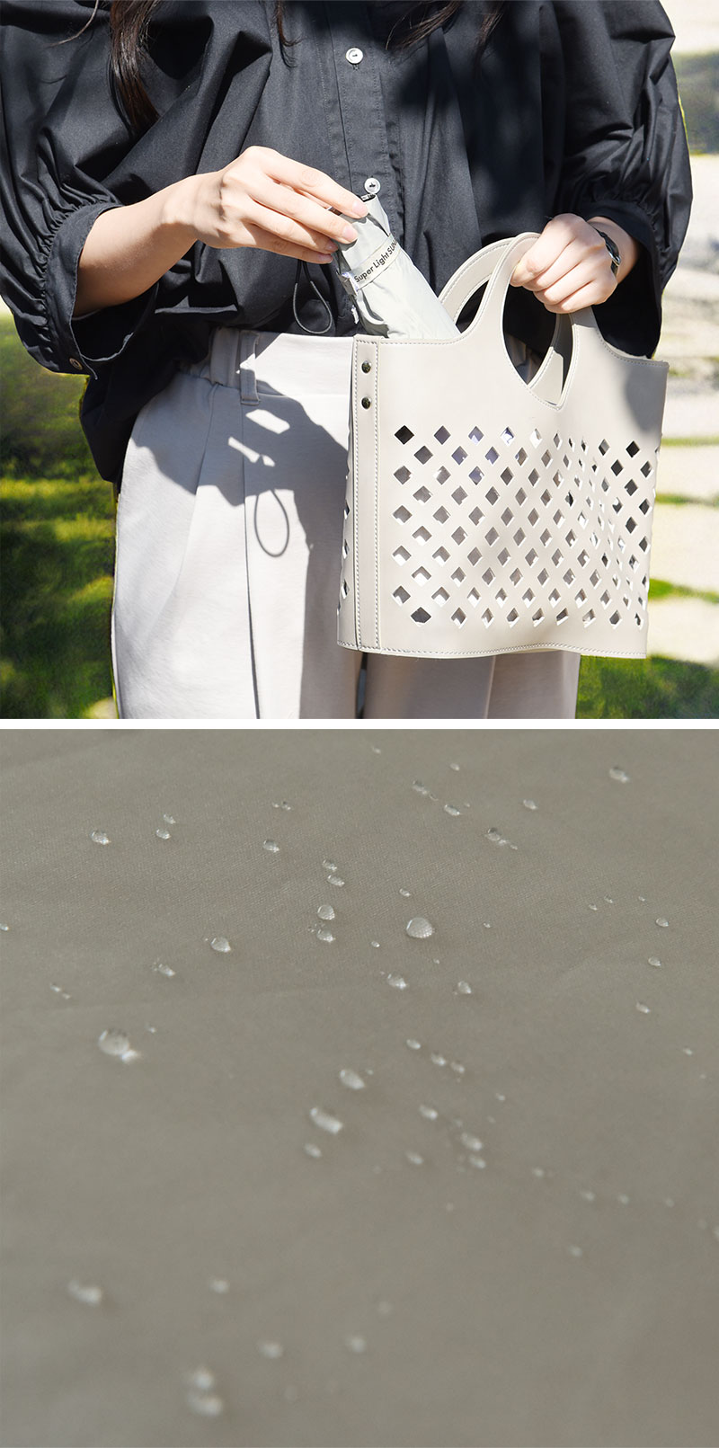 撥水性、耐水性に優れた素材を使用しているので急な雨でも安心。曇りの日や雨の日も紫外線はゼロではないので、雨傘として使いながら紫外線もブロックできるのは嬉しいポイント。