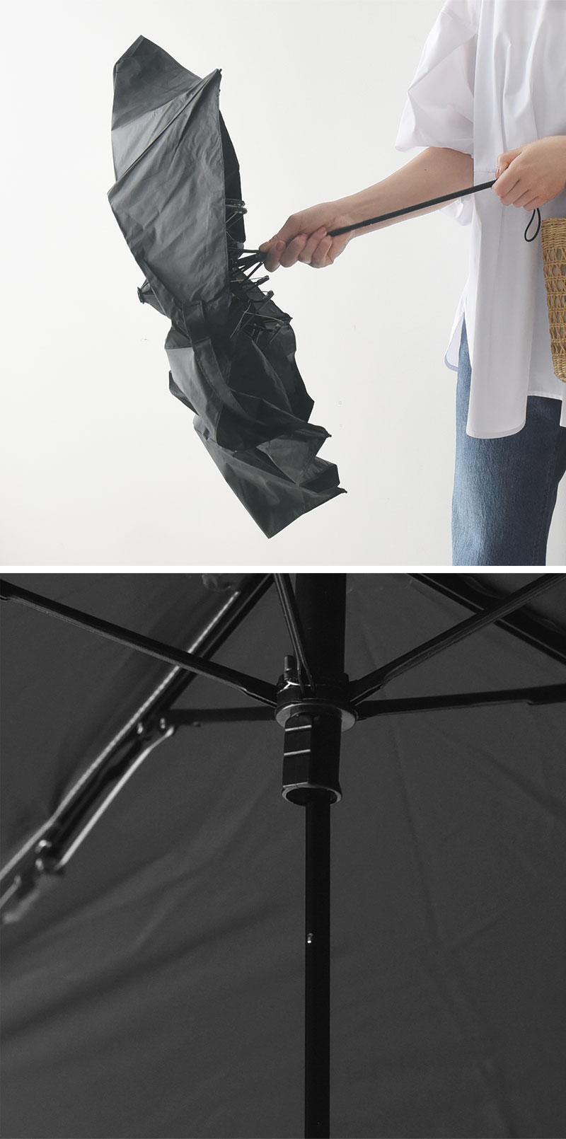 ※ご使用の際は、生地をほぐしてから開閉して下さい。無理に開くと骨が折れたり、傘全体に負担がかかる原因となります。