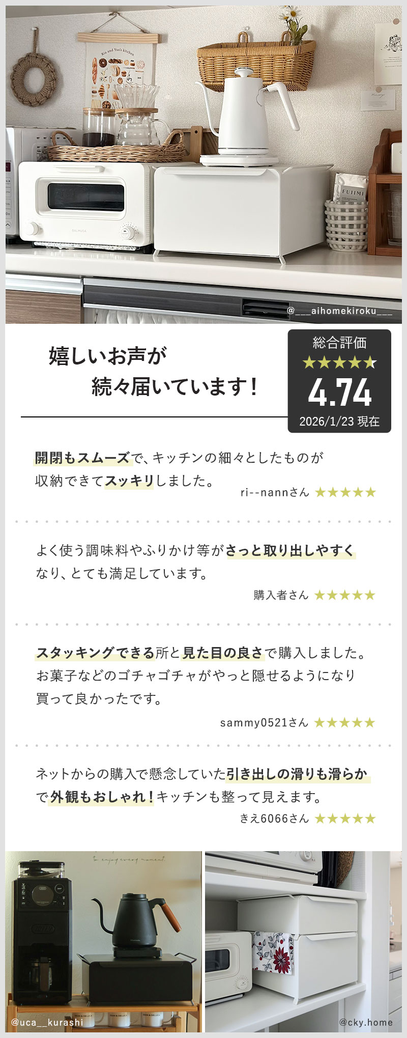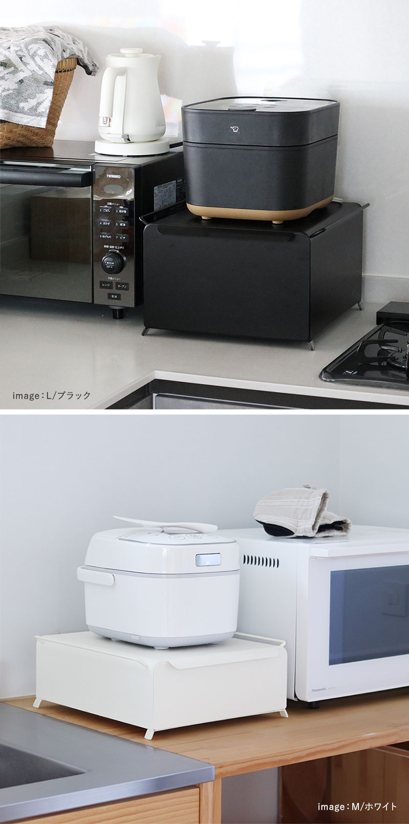 高さを選べる2サイズ展開。天板には、炊飯器やケトル、コーヒーサーバーがちょうどよく収まるサイズ感だから、デッドスペースを活用しながら収納を増やせる一品です。
