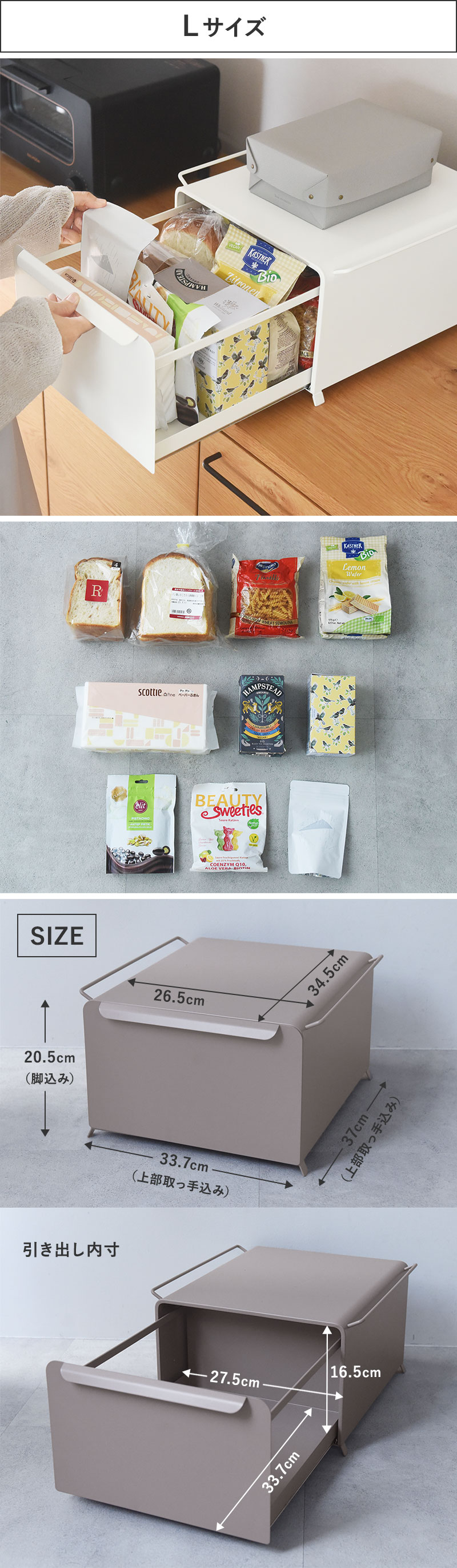 高さがあるLサイズには食パンやコーヒー、紅茶グッズ、乾物、缶ものを。立てて入れておきたい物の収納にも◎です。