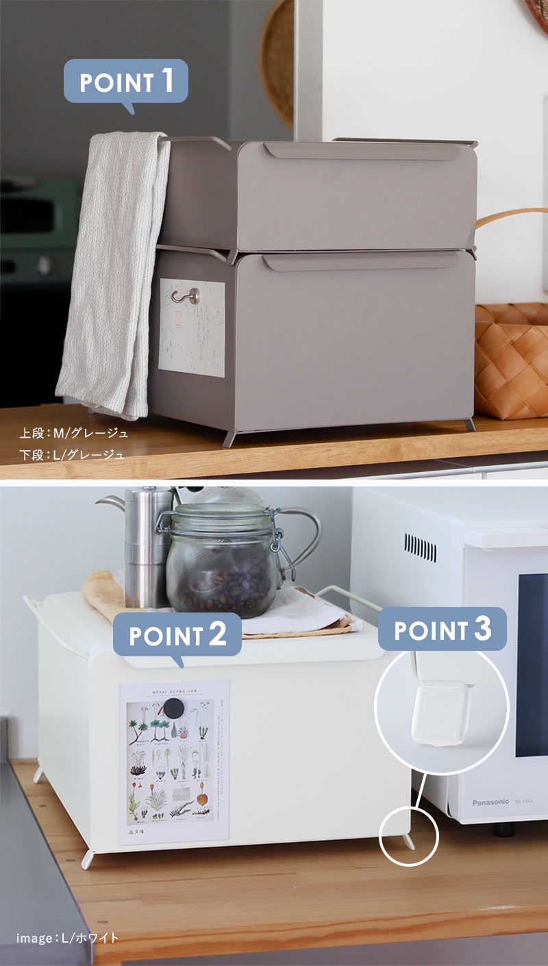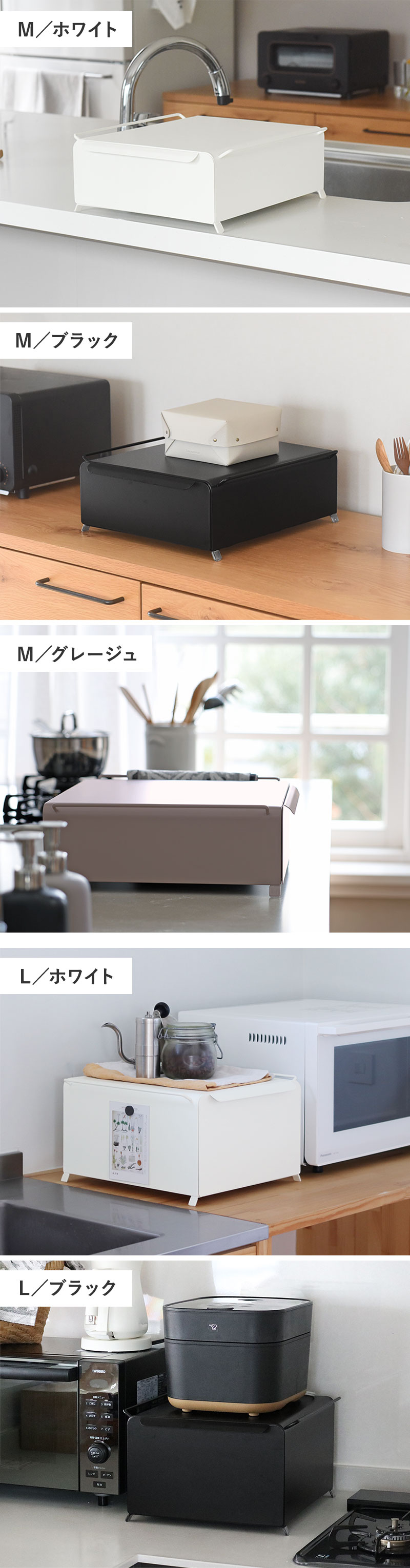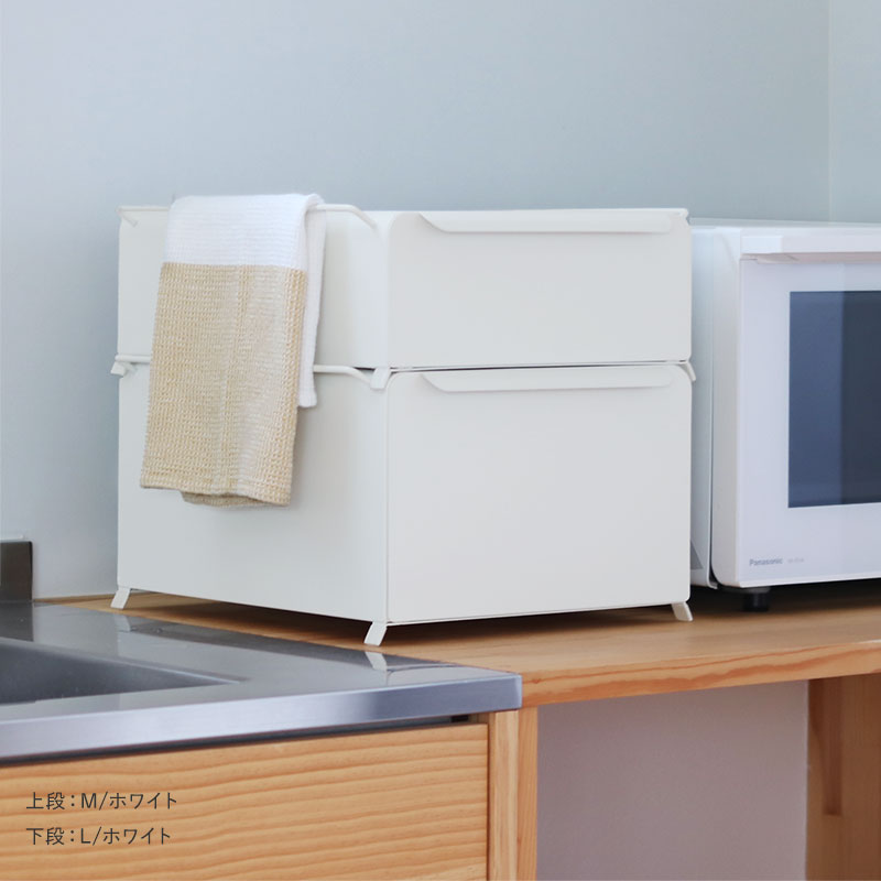 Mサイズ、Lサイズともに3色展開。すっきり清潔感のあるホワイト、空間を引き締めるブラック、ナチュラルに馴染むグレージュからお選びいただけます。