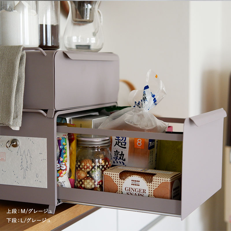 Mサイズは浅めの作りなので、ロールパンなど高さのないパンや、コーヒー、紅茶グッズをまとめても。サランラップやホイルなどキッチンまわりの小物を収納するのにもぴったりです。