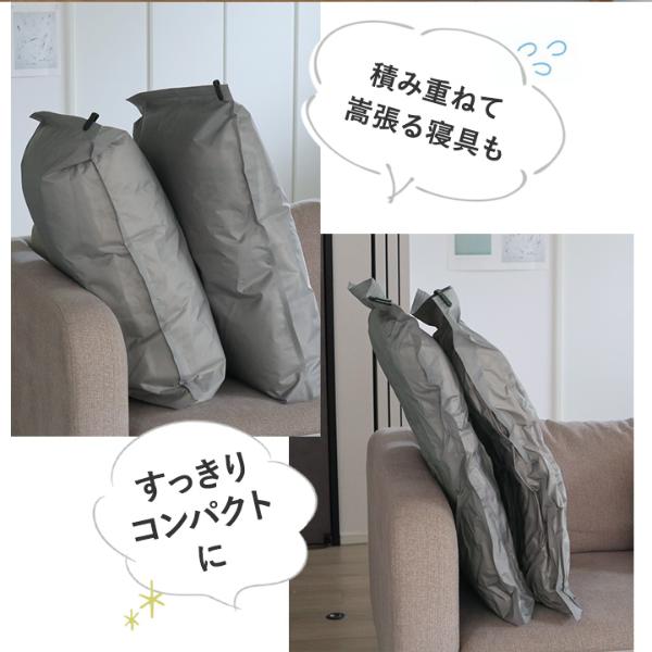 強い力を入れなくてもスムーズに空気が抜けて、ギュギュッと圧縮。抜群の圧縮力で空気がぬけてくる心配もなし。シーズンオフの寝具類もペタンコで収納しておけます。
