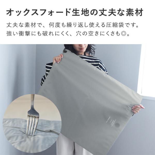 よくあるビニール製の圧縮袋ではなく、まるで布地のようなオックスフォード素材。薄手なのにとっても丈夫で、繰り返し何度でも使えます。