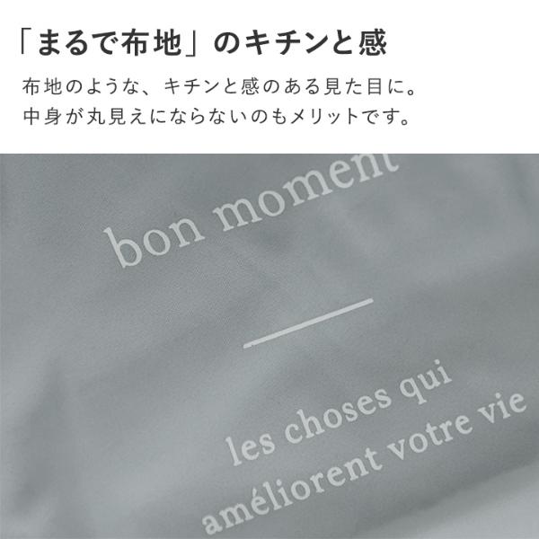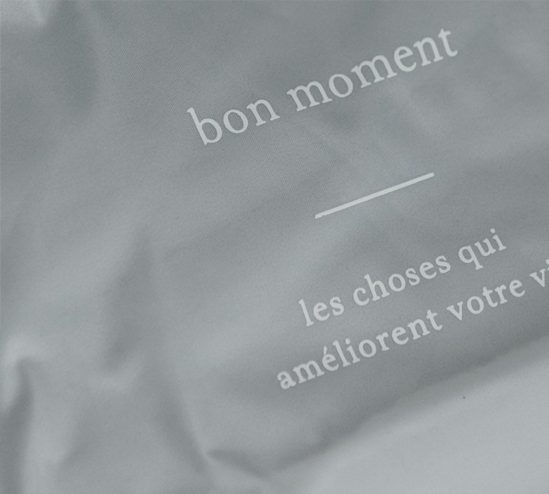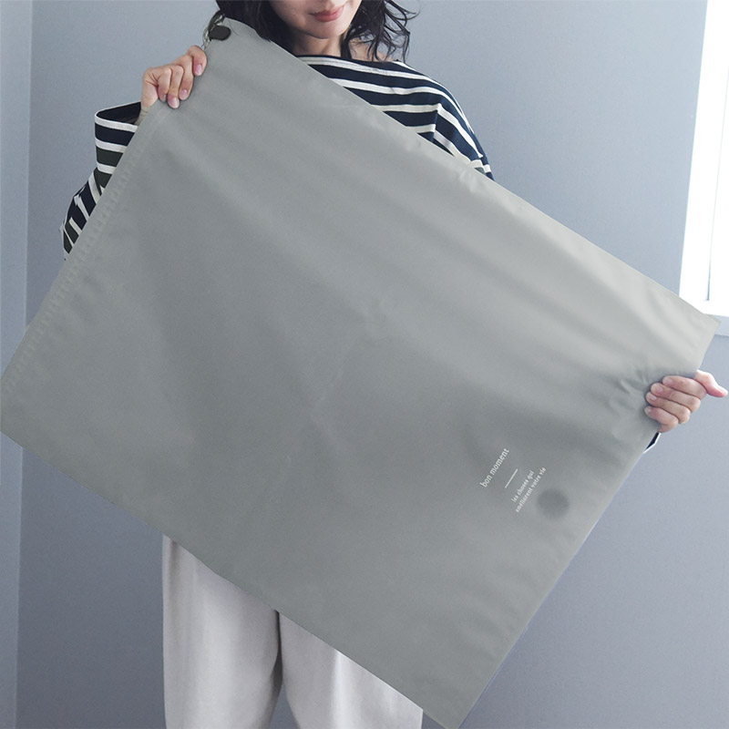 「まるで布地」のキチンと感オックスフォード生地を使うことで、まるで布地のような、キチンと感のある見た目に。中身が丸見えにならないのもメリットです。bon momentのロゴを入れたシンプルなデザインは、ユニセックスでお使いいただけます。