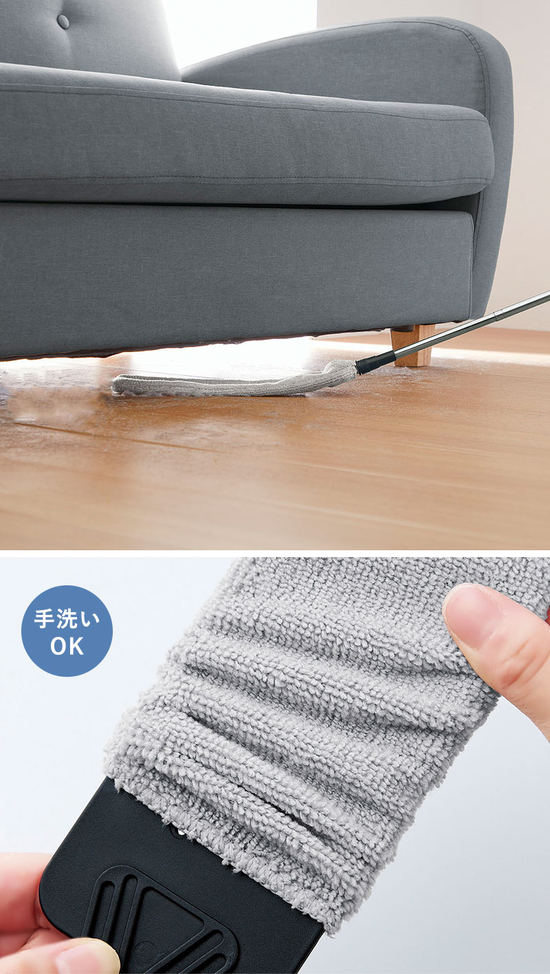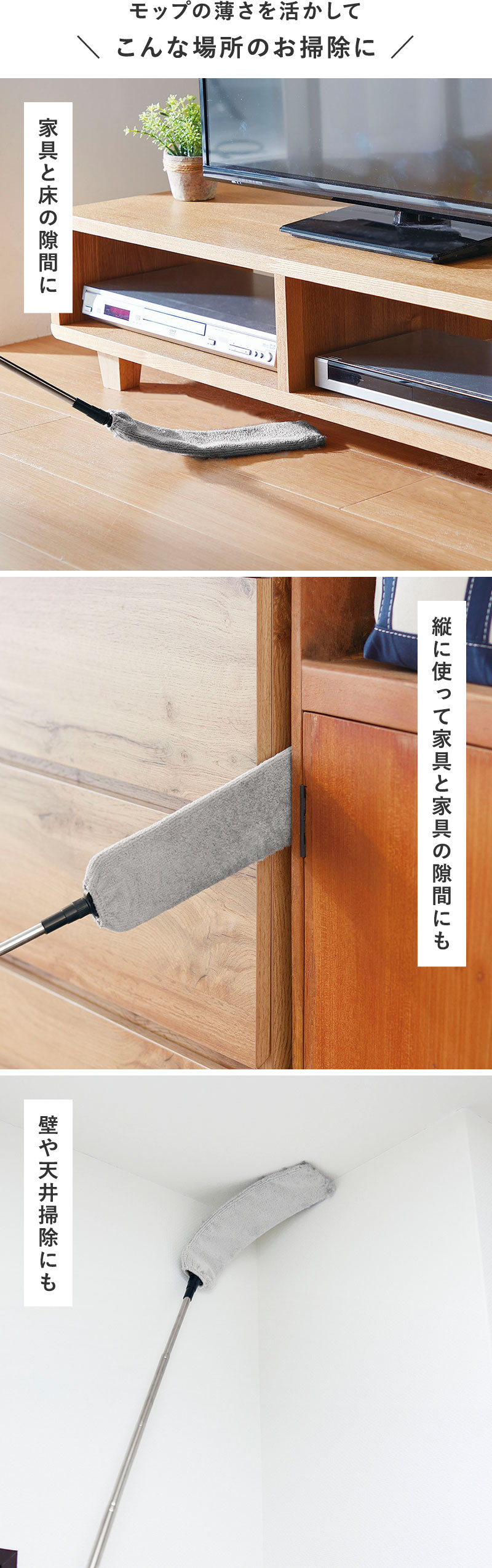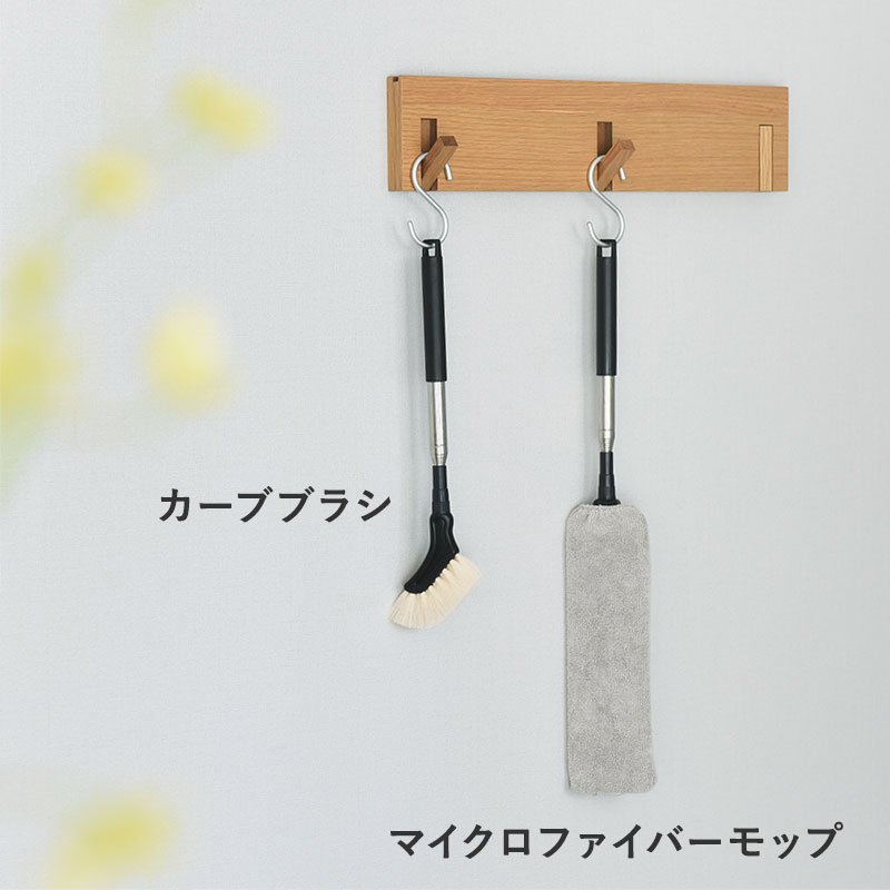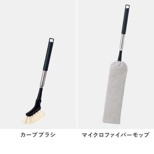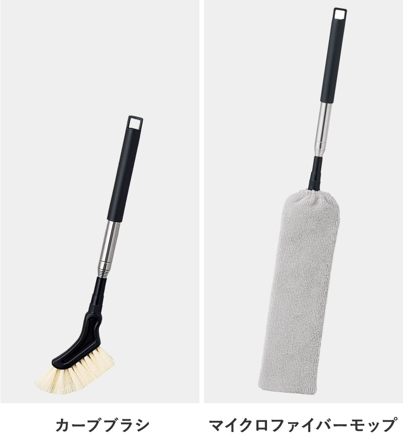 - 家具と家電の隙間、床と家具の隙間など、今まで届かなかった場所のお掃除ができるカーブブラシとマイクロファイバーモップ。柄が伸びるので狭い場所もスイスイお掃除できます。