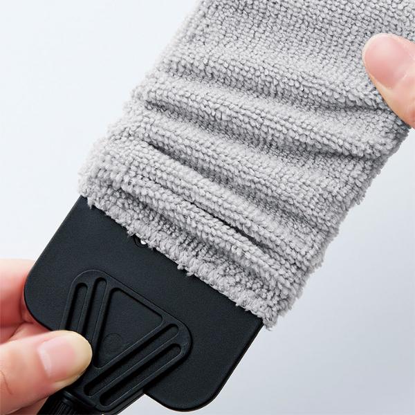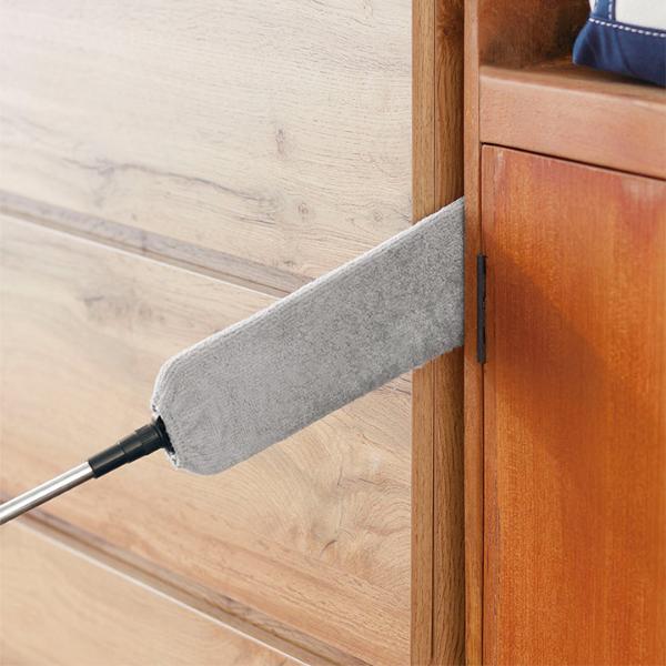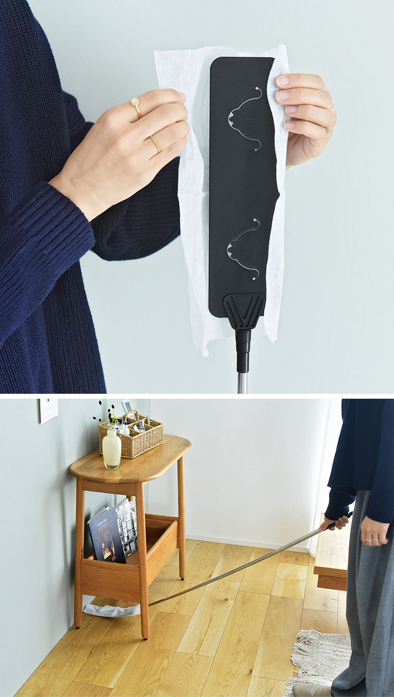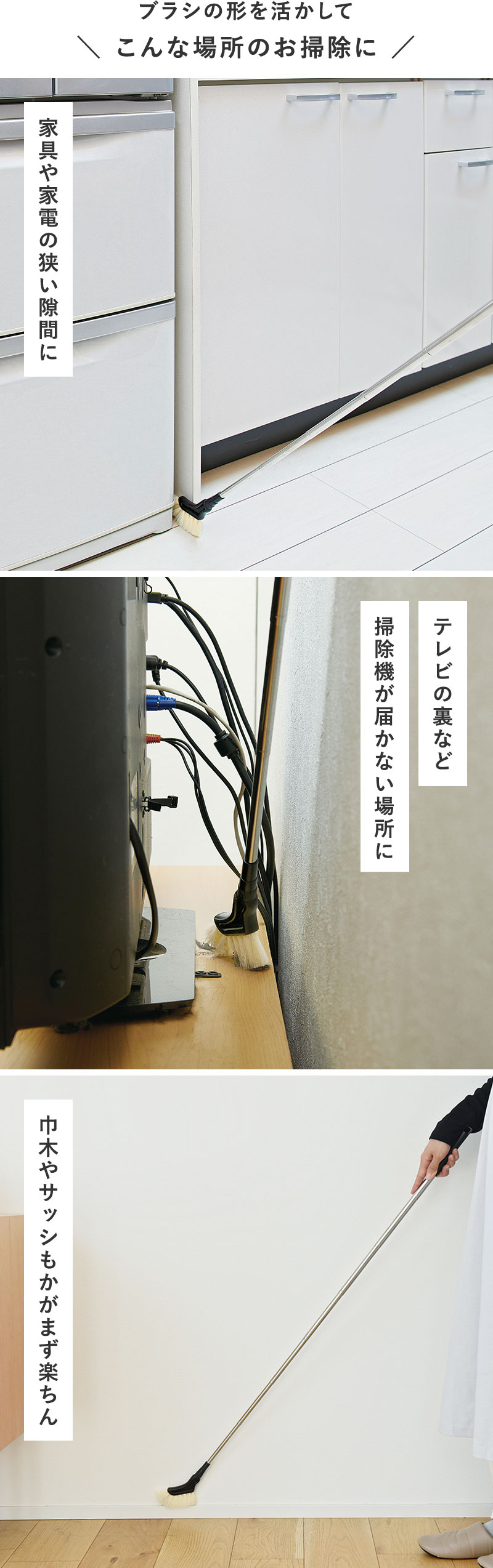 - 家具と家電の隙間、床と家具の隙間など、今まで届かなかった場所のお掃除ができるカーブブラシとマイクロファイバーモップ。柄が伸びるので狭い場所もスイスイお掃除できます。