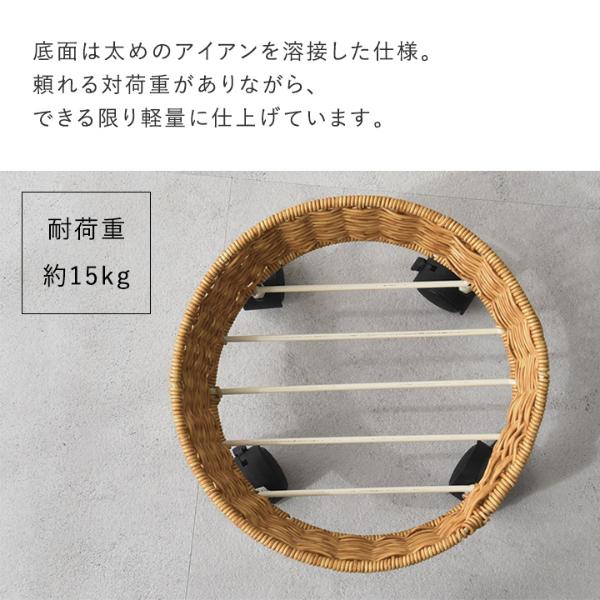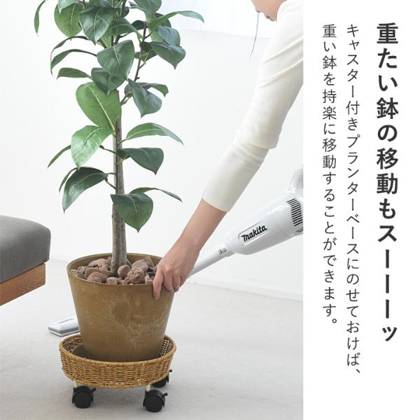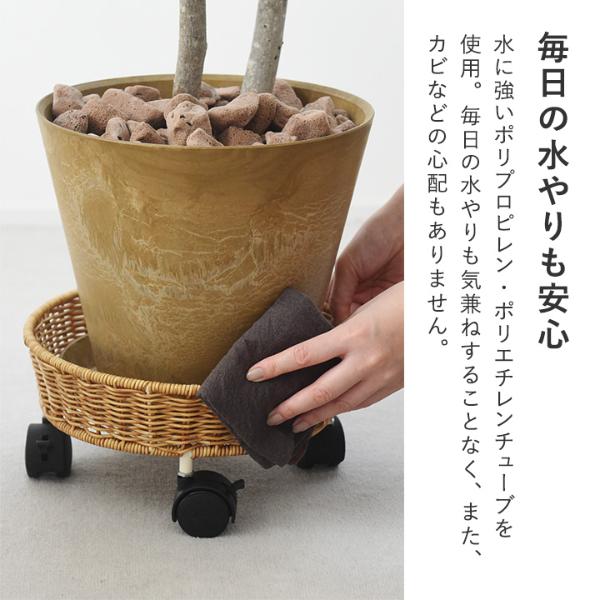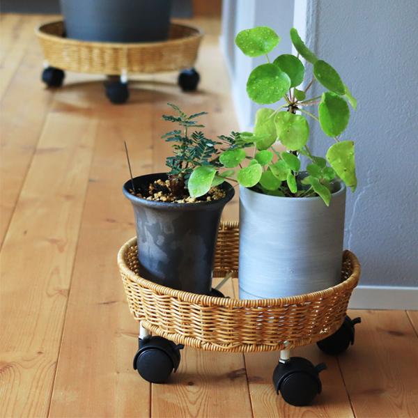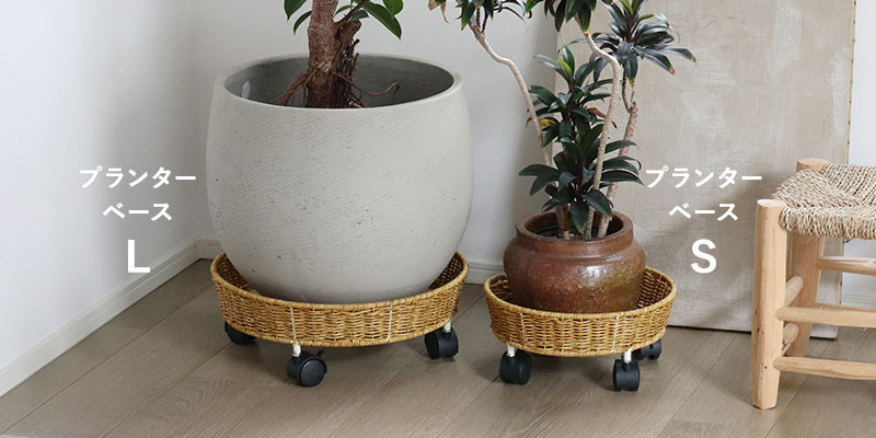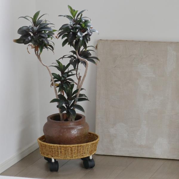 まるで天然素材のラタンを編んだような、ナチュラルな佇まいのプランターベース。植物との相性はもちろん、周りの家具やフローリングの木目とも馴染んでくれます。