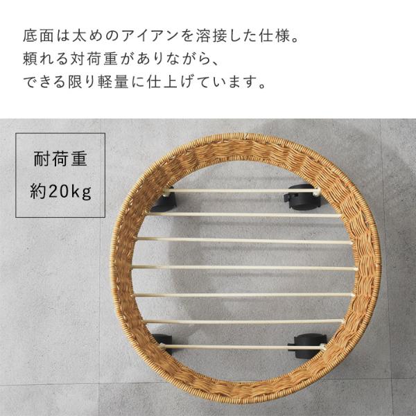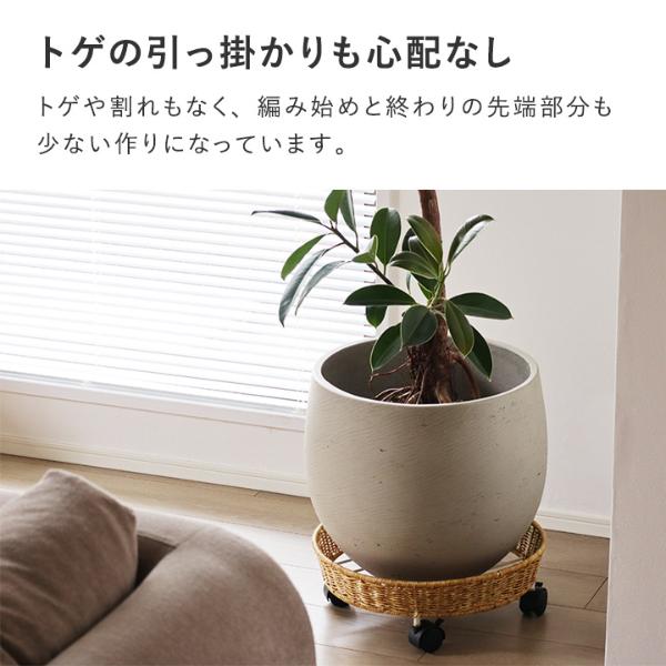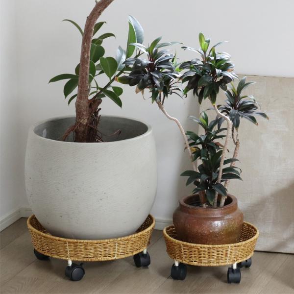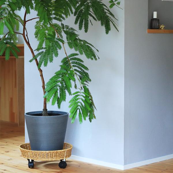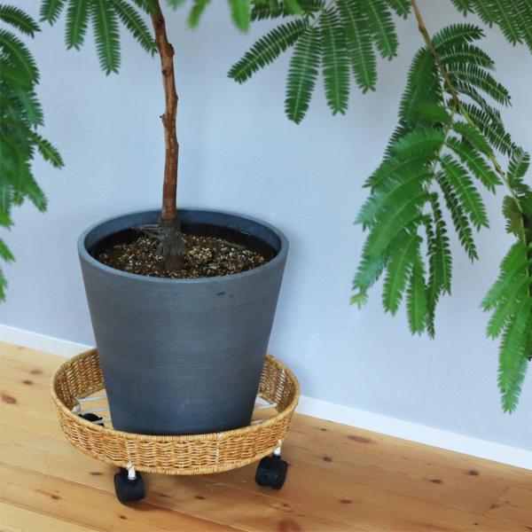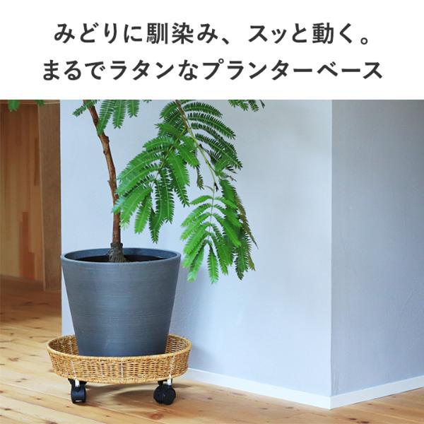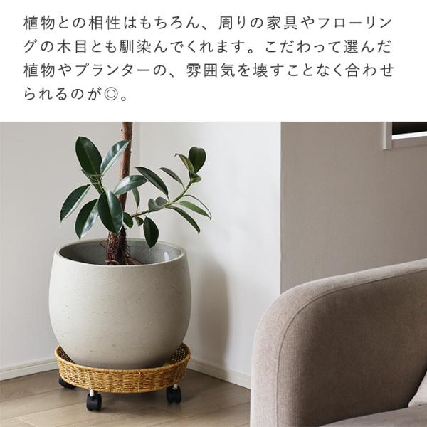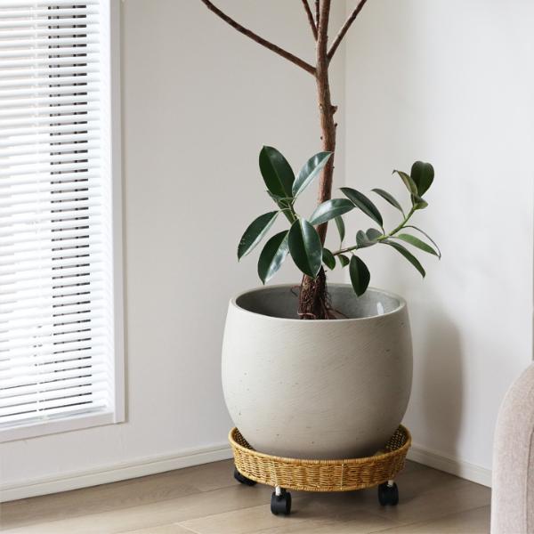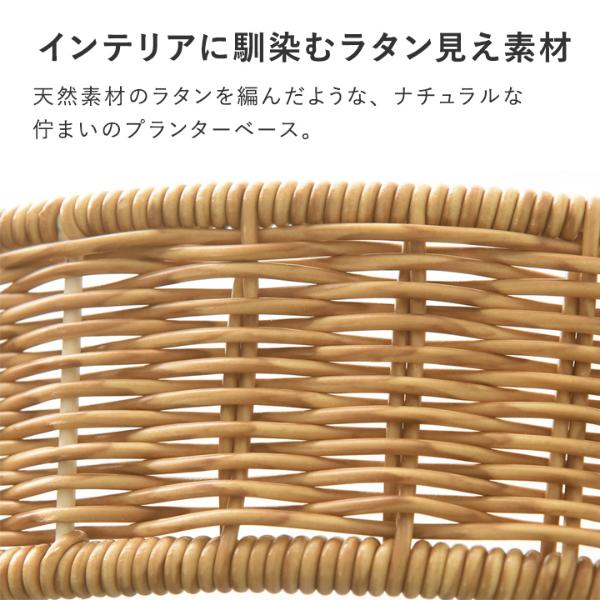 まるで天然素材のラタンを編んだような、ナチュラルな佇まいのプランターベース。植物との相性はもちろん、周りの家具やフローリングの木目とも馴染んでくれます。