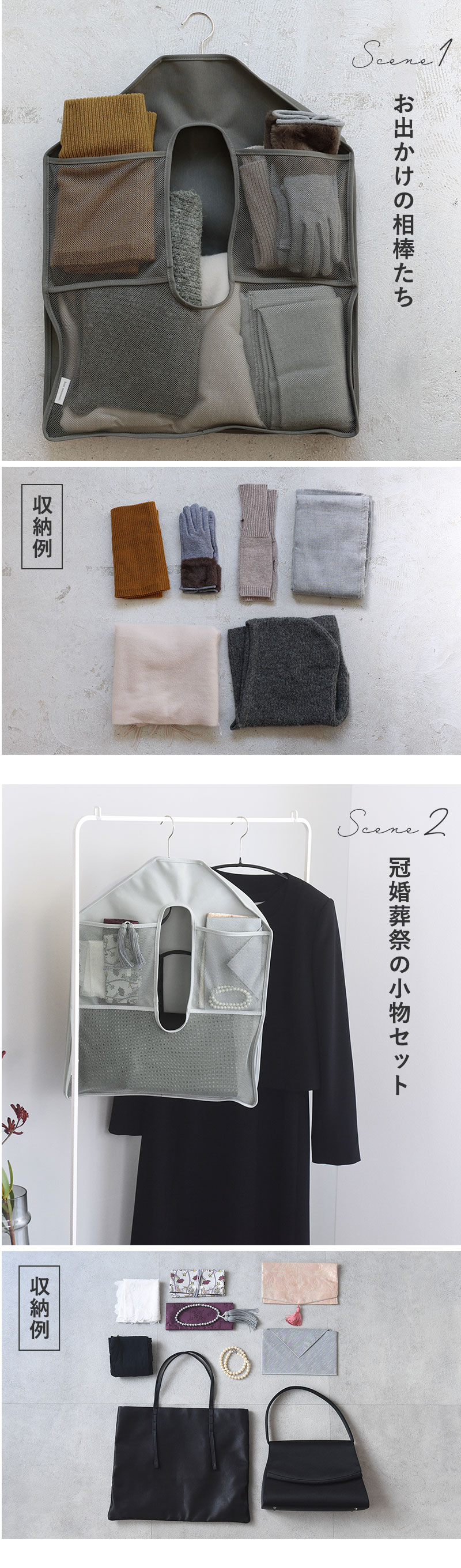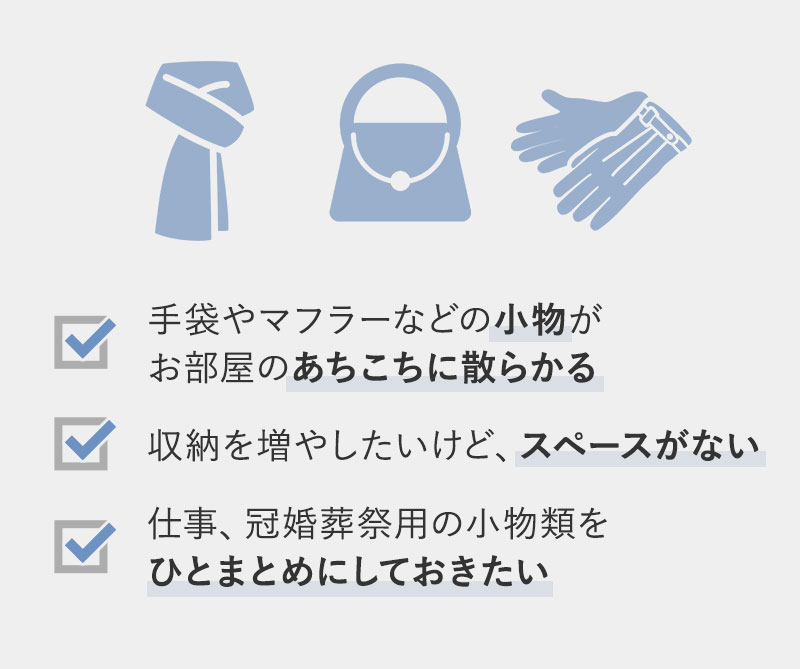 毎日のように使う冬小物の置き場所にするのも、ブラックフォーマル小物をしまっておく場所にするのも◎。お好きなものを入れてお使いいただけます。
