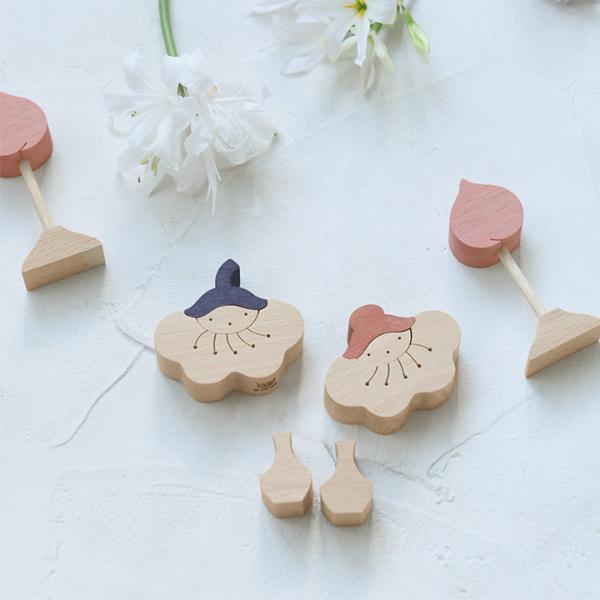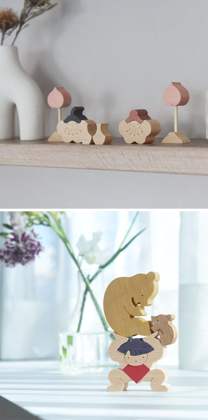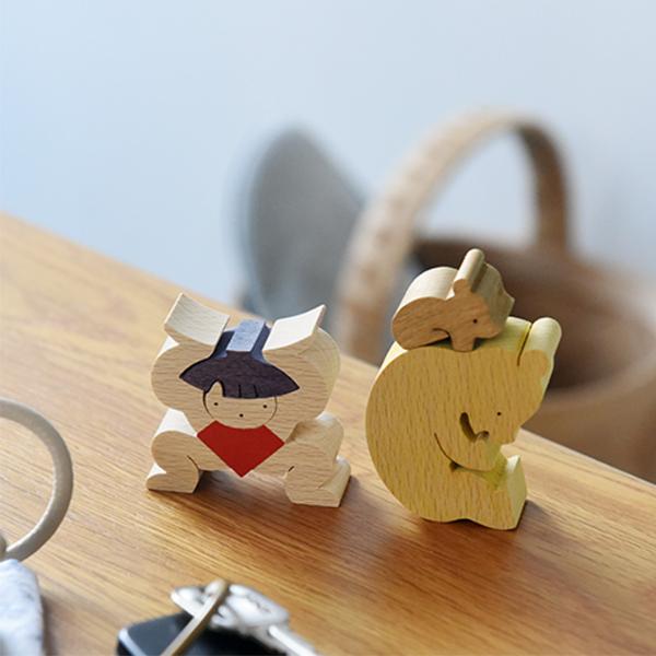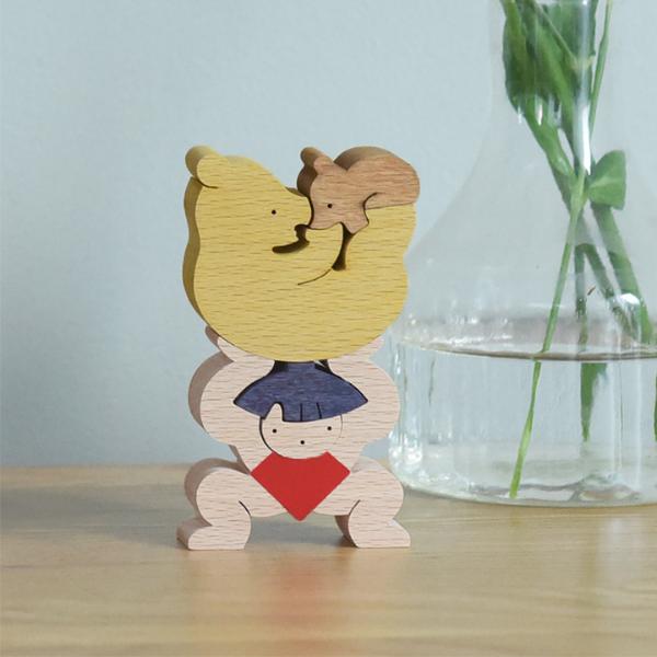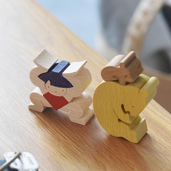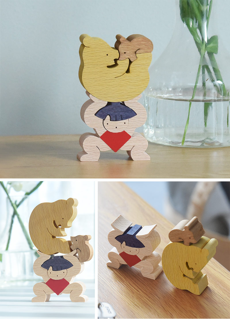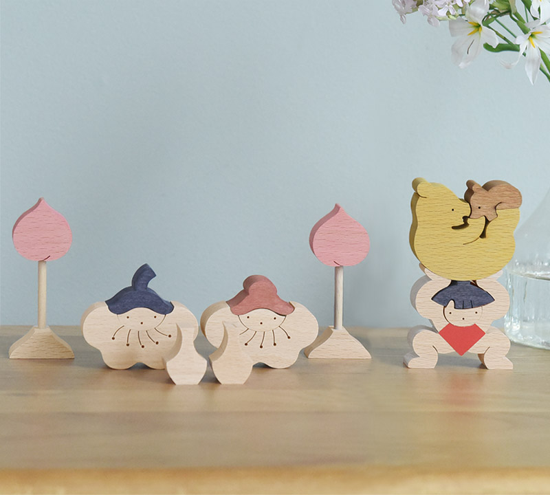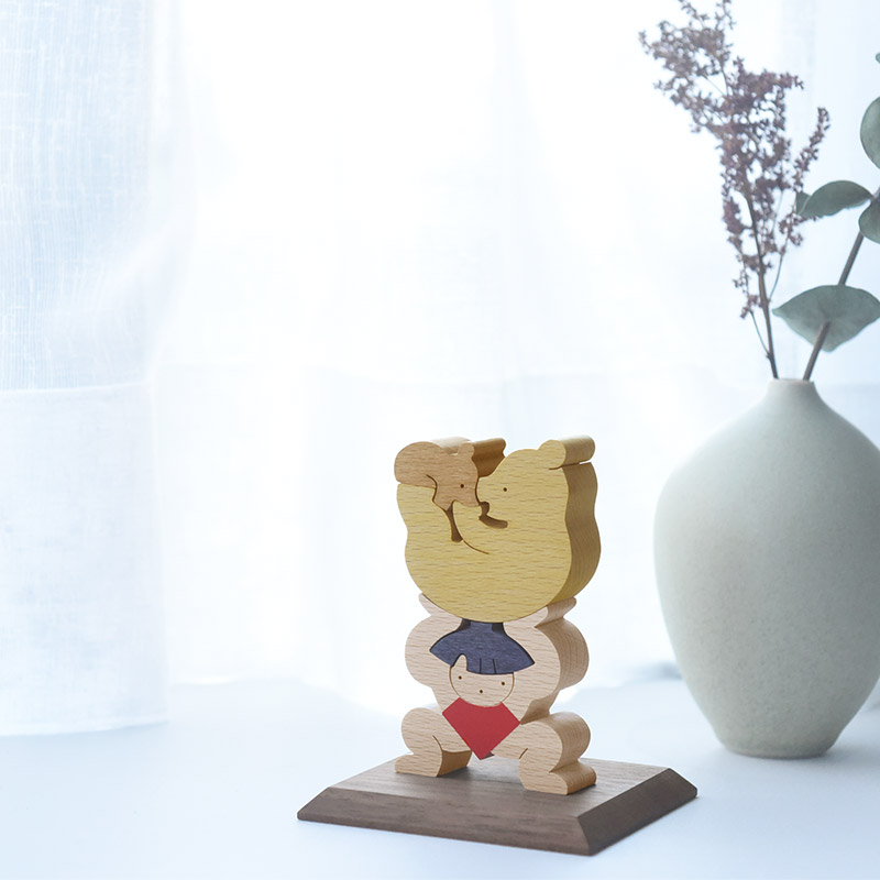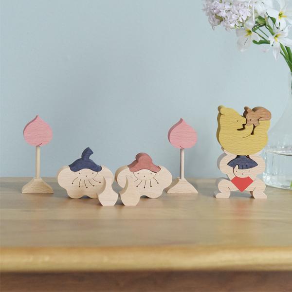 五月人形の定番、金太郎がクマの親子を持ち上げている組み木。積み上げたり、逆さまにしてみたり、さまざまなレイアウトでお話をつくるのも楽しそうです。