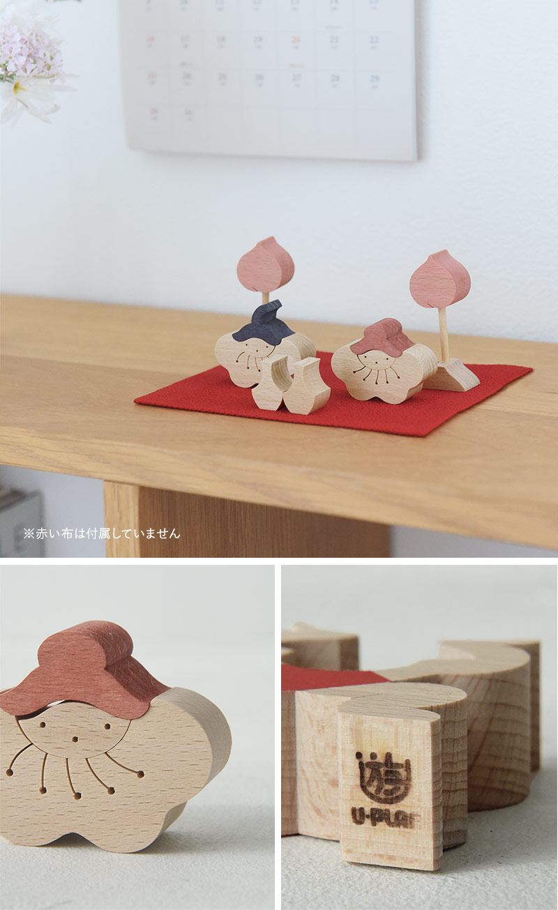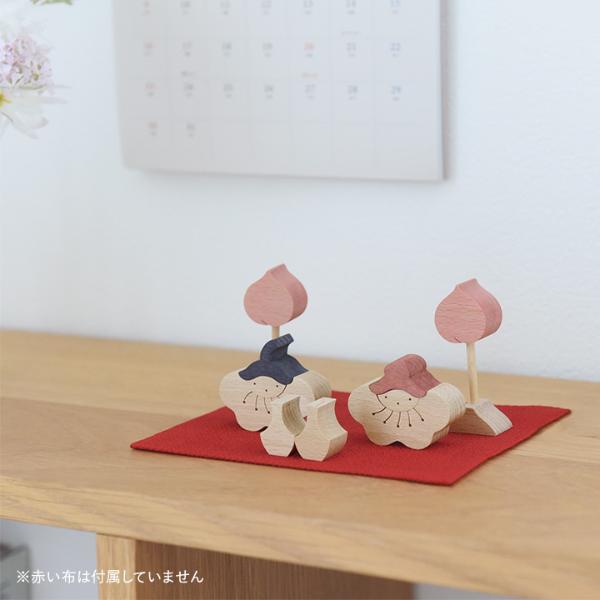 桃の花の形をした内裏さまと、桃の実の形をした一対のぼんぼりによるお雛様です。逆さまにして眺めると、ぱっと開いた五弁の花の形が表れます。