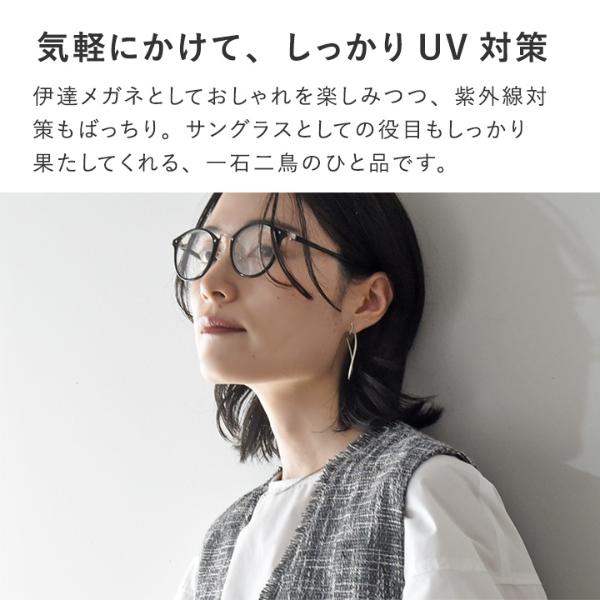 伊達メガネとしておしゃれを楽しみつつ、紫外線対策もばっちり。サングラスとしての役目もしっかり果たしてくれる、一石二鳥のひと品です。
