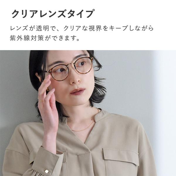 レンズが透明で、クリアな視界をキープしながら紫外線対策ができます。伊達メガネのようなビジュアルで、屋内外問わずかけっぱなしでも違和感がありません。