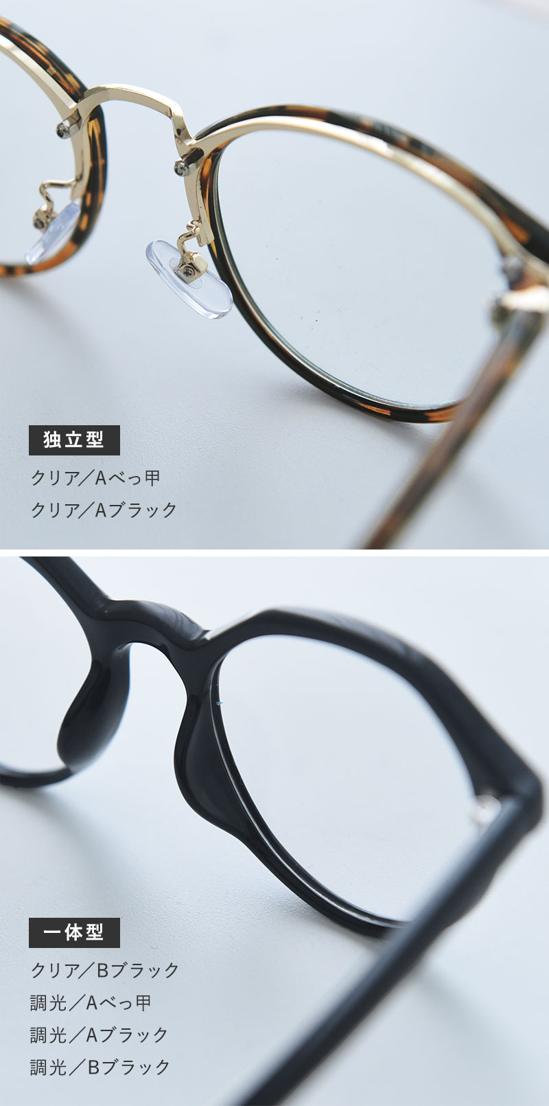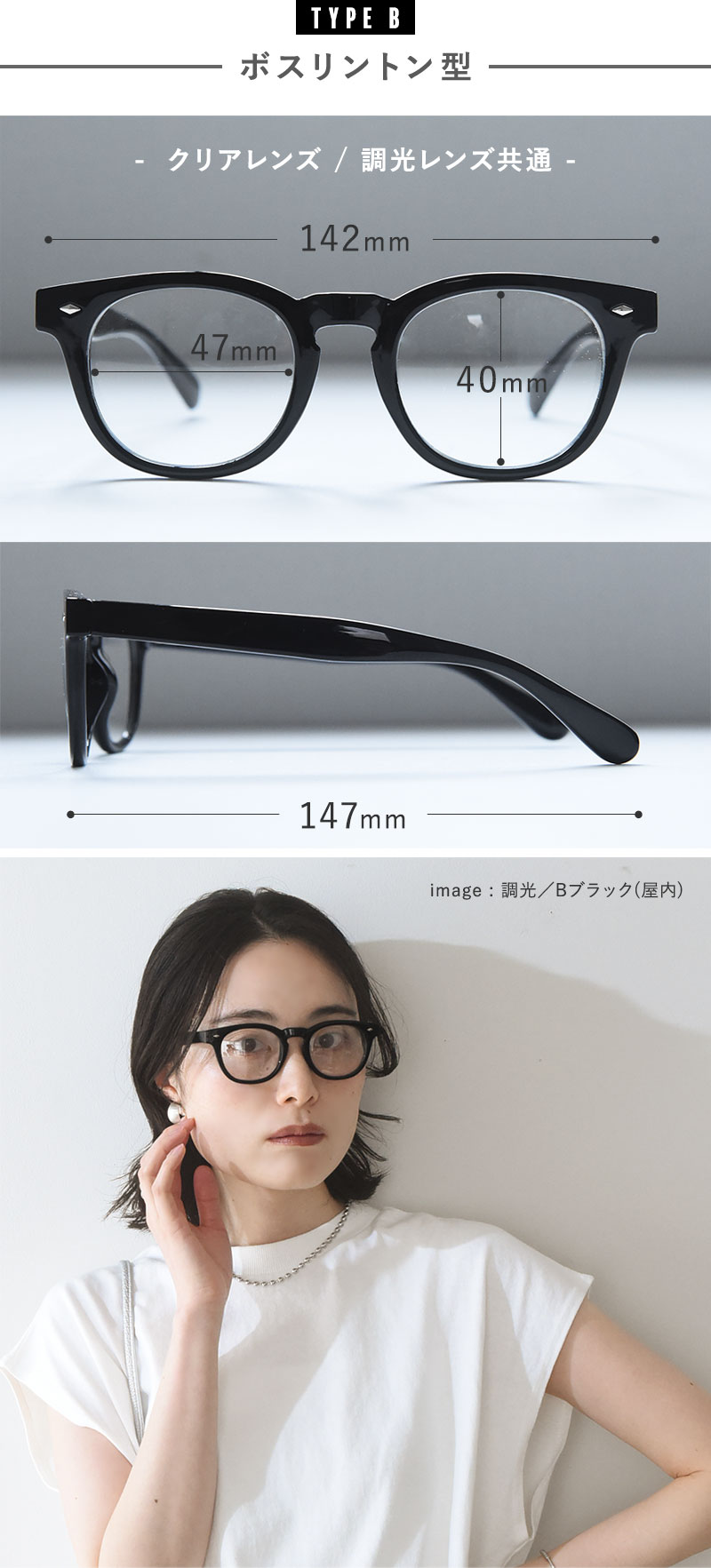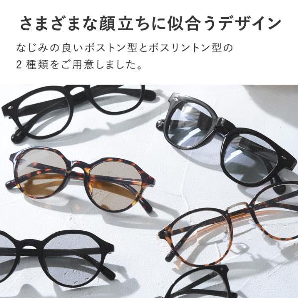 さまざまな顔立ちに似合う、定番のボストン型とボスリントン型の2種類をご用意。さらにレンズは、クリアタイプと調光タイプからお選びいただけます。