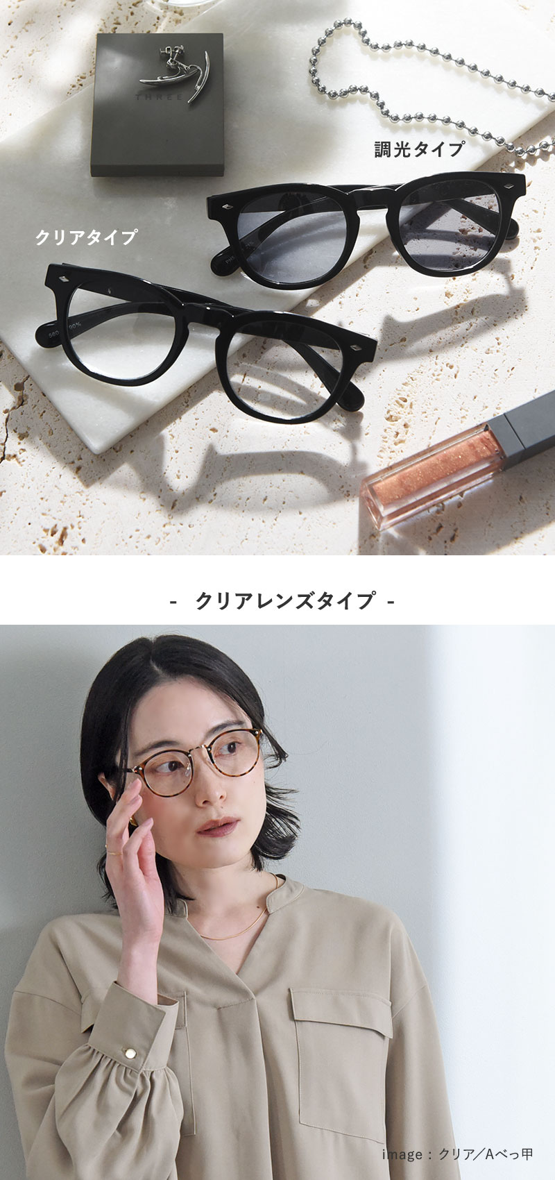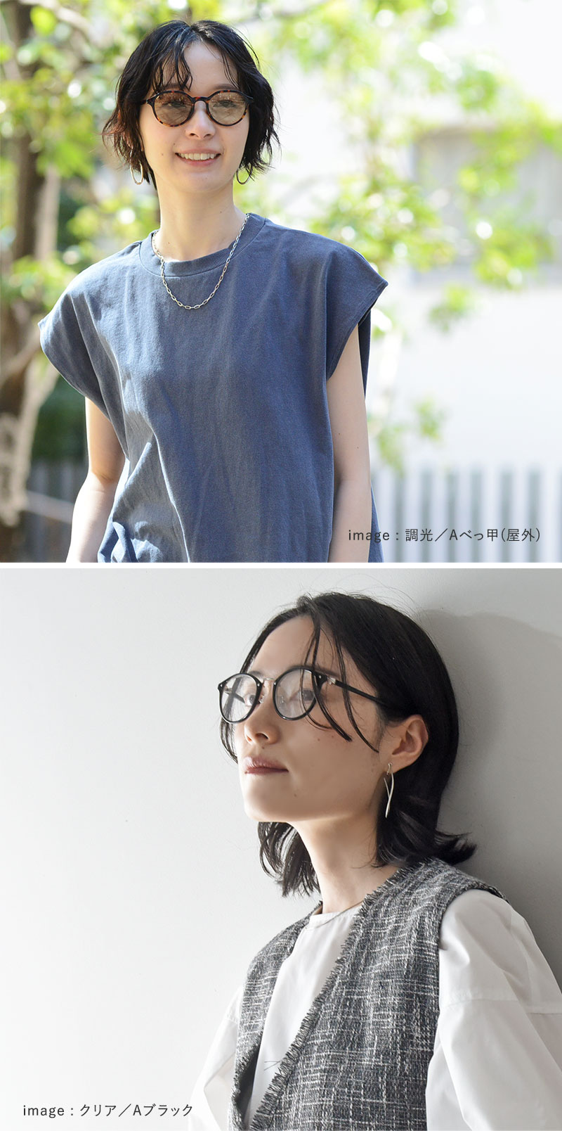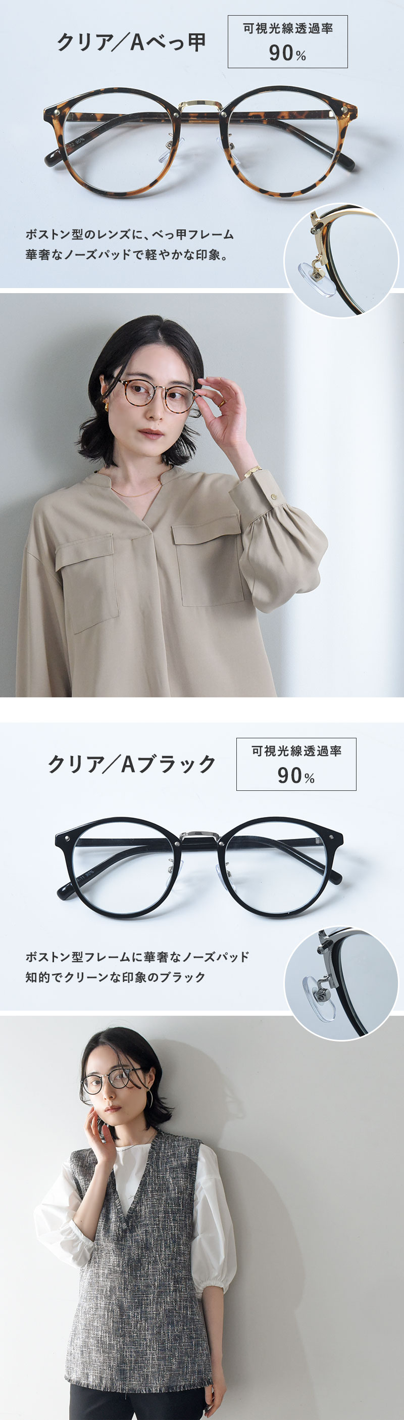 さまざまな顔立ちに似合う、定番のボストン型とボスリントン型の2種類をご用意。さらにレンズは、クリアタイプと調光タイプからお選びいただけます。