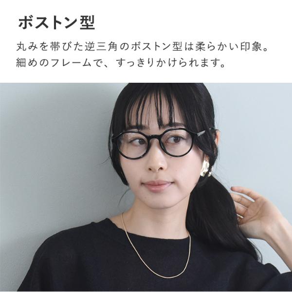 ボストン型丸みを帯びた逆三角のボストン型は、柔らかい印象で日常使いしやすいデザインです。細めのフレームで、すっきりかけられます。