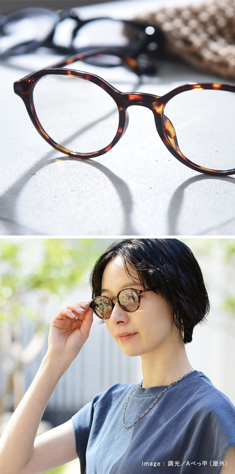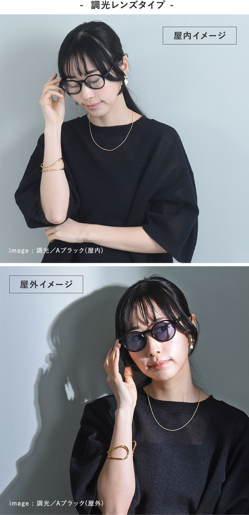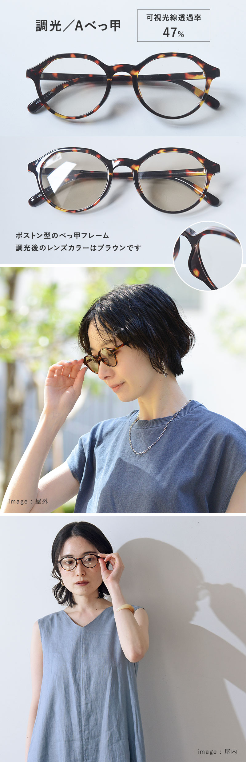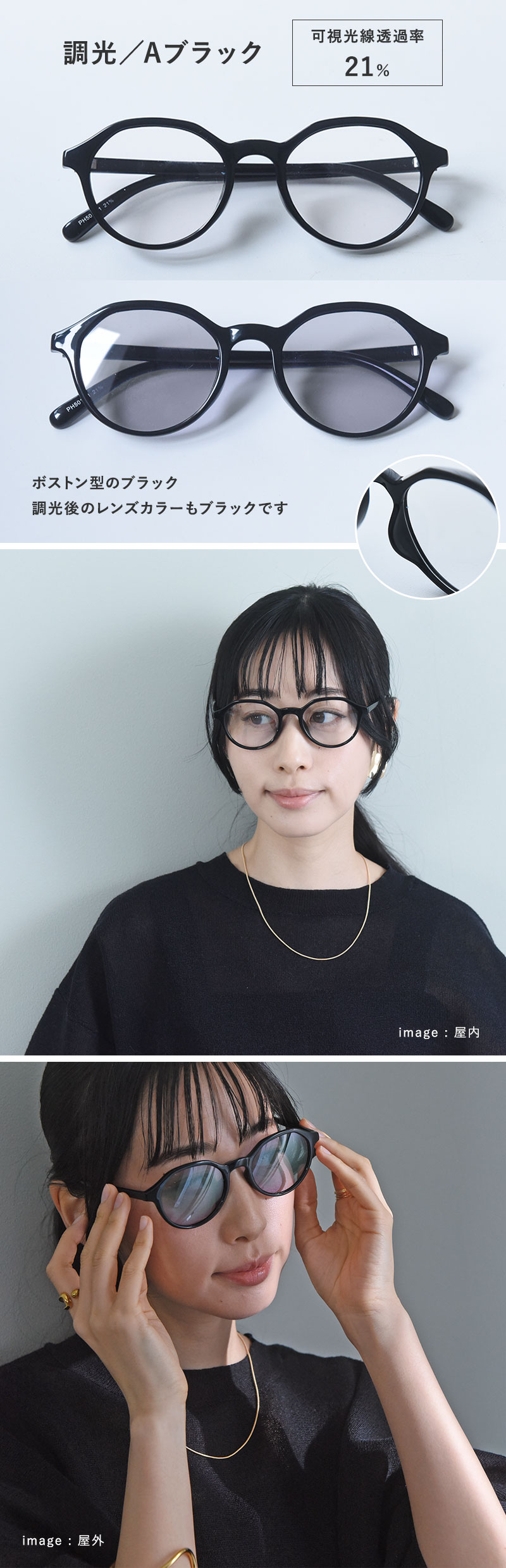 サングラス&伊達メガネ、2通りの楽しみ方ができます。色が自然に調整されるので、屋内でも屋外でもつけっぱなしでもOK。