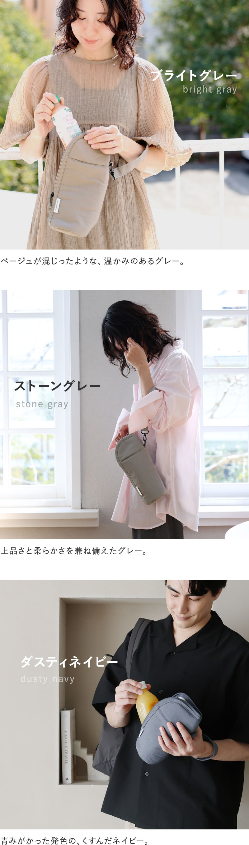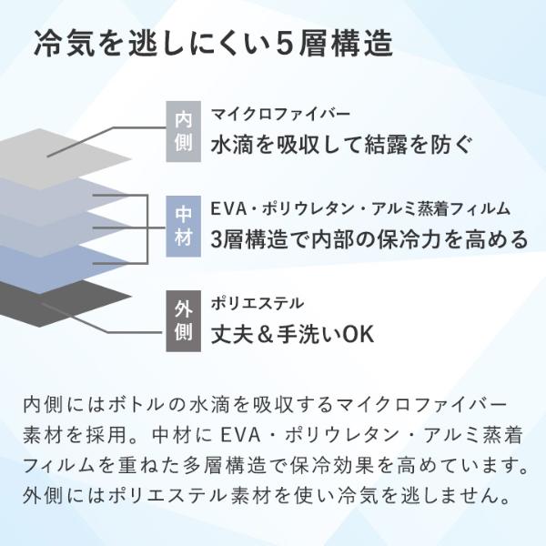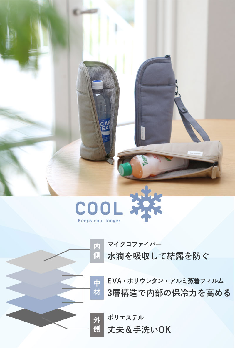 飲み物と接する内側には、ボトル表面の水滴をしっかり吸収するマイクロファイバー素材を採用。さらに中材にEVA・ポリウレタン・アルミ蒸着フィルムを重ねた多層構造で保冷・保温効果を高めています。