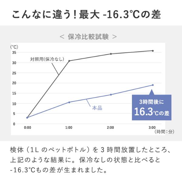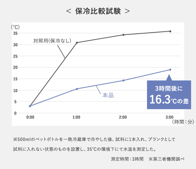 検体(1Lのペットボトル)を3時間放置したところ、上記のような結果に。保冷なしの状態と比べると-16.3℃もの差が生まれました。