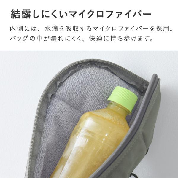 内側には、吸水性が高く、時間が経っても水滴を吸収するマイクロファイバーを採用。バッグの中が濡れにくく、快適に持ち歩けます。