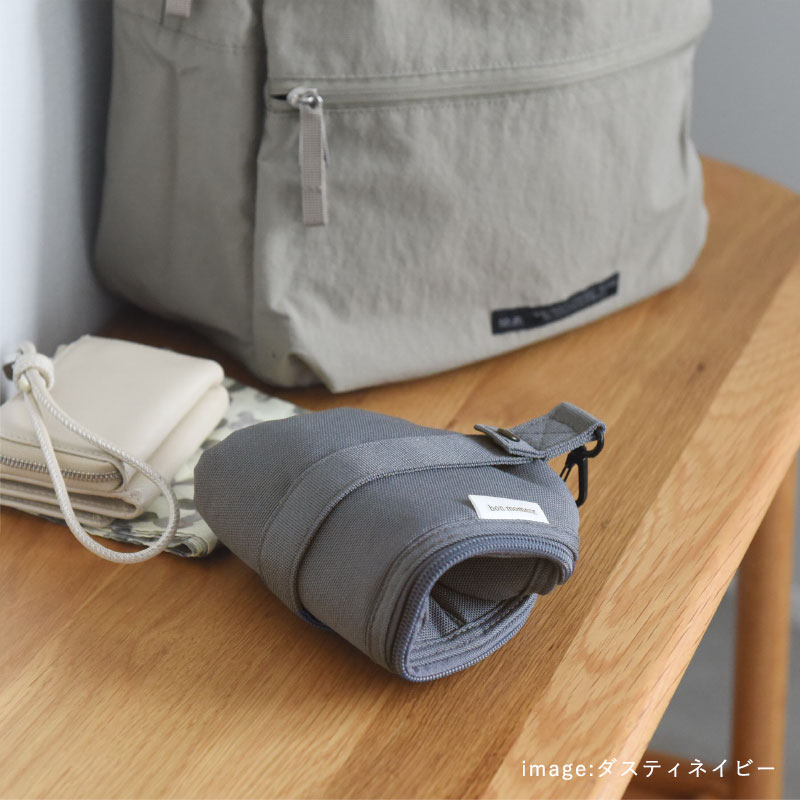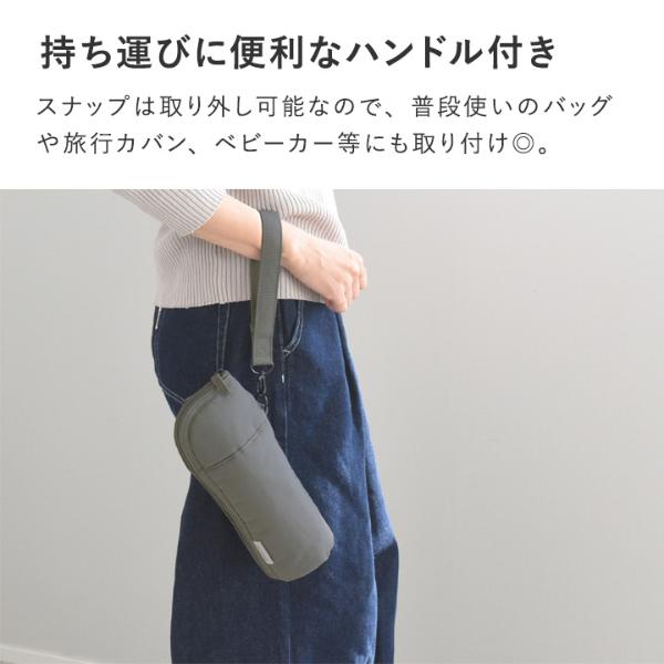 サッと掴んだり、手首に掛けたりできるハンドル付き。スナップは取り外し可能なので、普段使いのバッグや旅行カバン、ベビーカー等にも取り付けることもできます。飲み終えた後は、二つ折りにしてハンドルで留めることも。バッグの中にすっきり収まります。