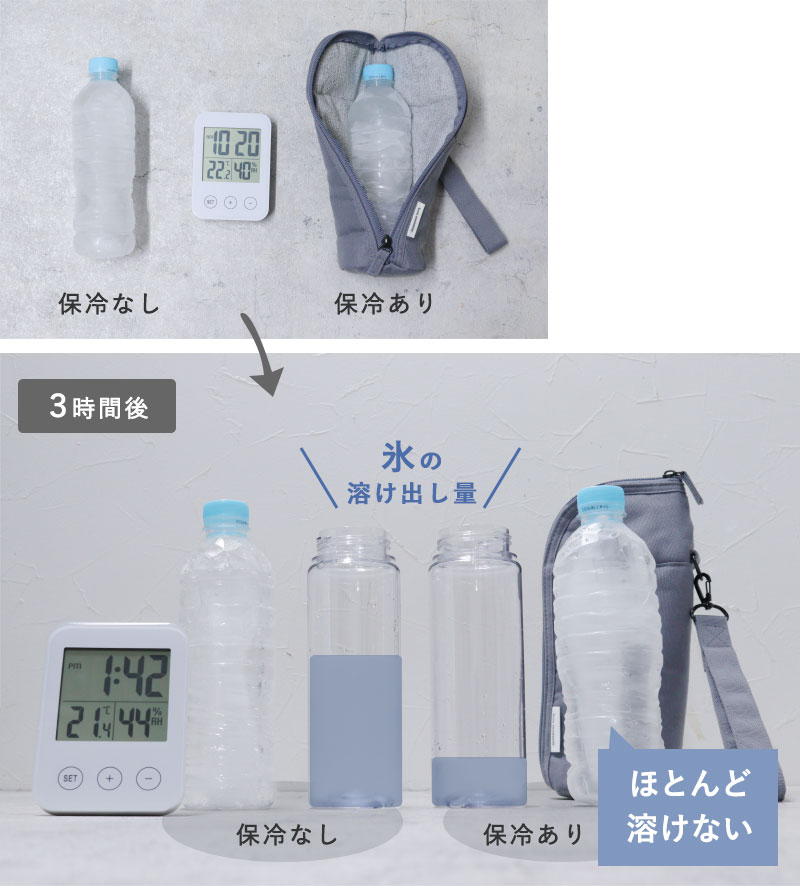 凍らせたペットボトルをそのまま置いた状態と、強保冷ペットボトルケースに入れた状態で比較したところ、3時間後の氷の溶け出し量は約3分の1という結果に。ほとんど氷が溶けることなく、優れた保冷力を発揮しました。
