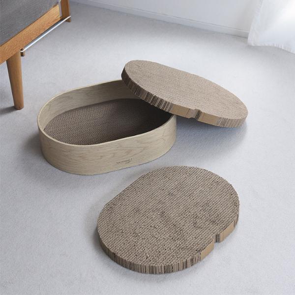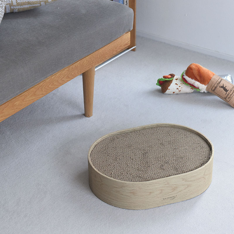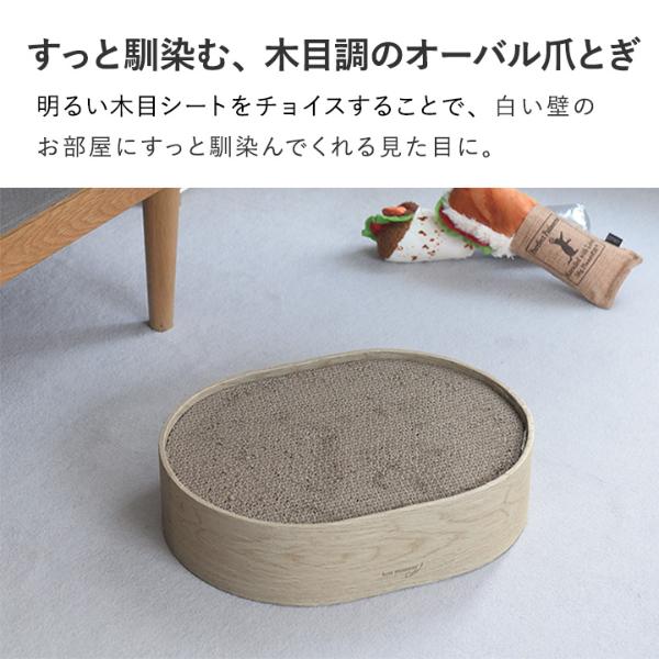 リビングに置きっぱなしでも空間に馴染む、木目調シートのオーバル爪とぎ。3枚セットで裏表どちらもお使いいただけます。クズが飛び散りにくい高密度ダンボールでお掃除も楽ちん。