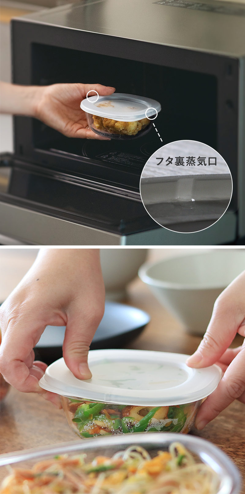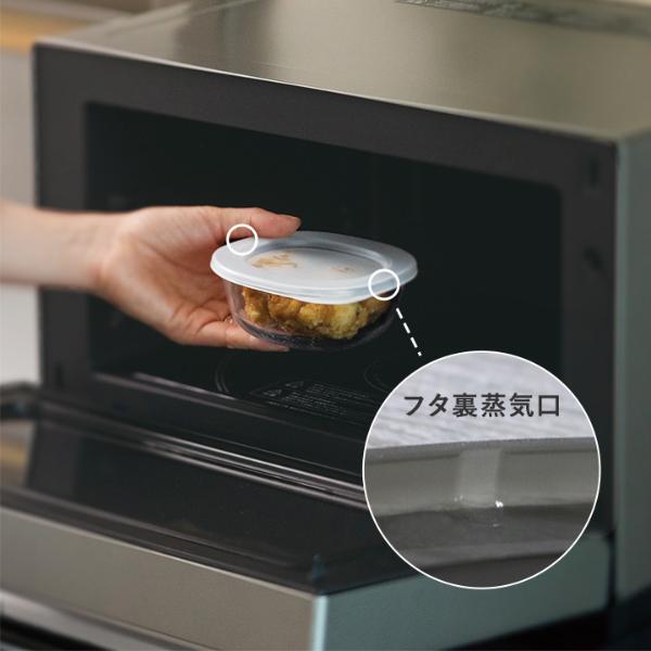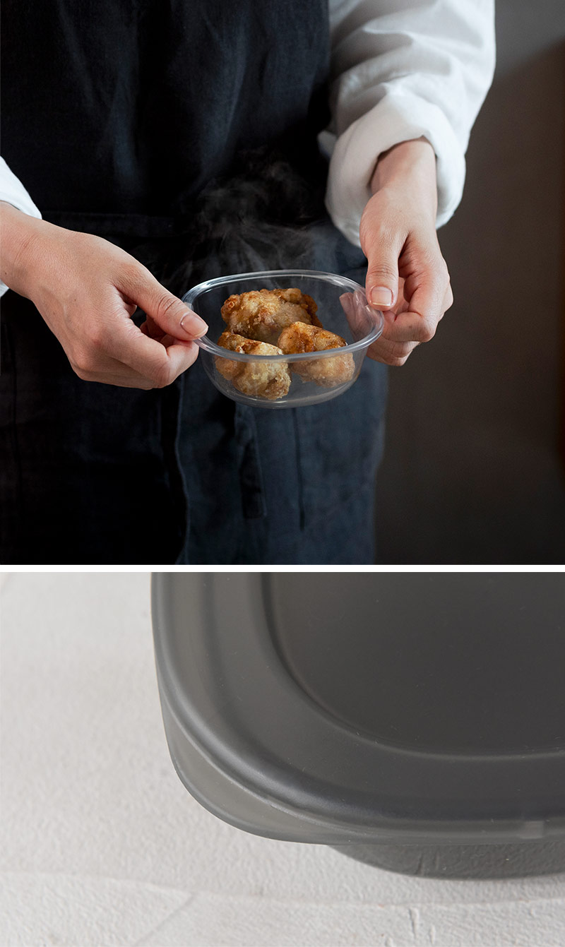さらにフタにも工夫があり、温めた時に小さいくぼみから蒸気が逃げる仕組みに。冷凍庫から出したものも、冷蔵庫から出したものも、どちらもフタをしたままレンジで温めることができます。