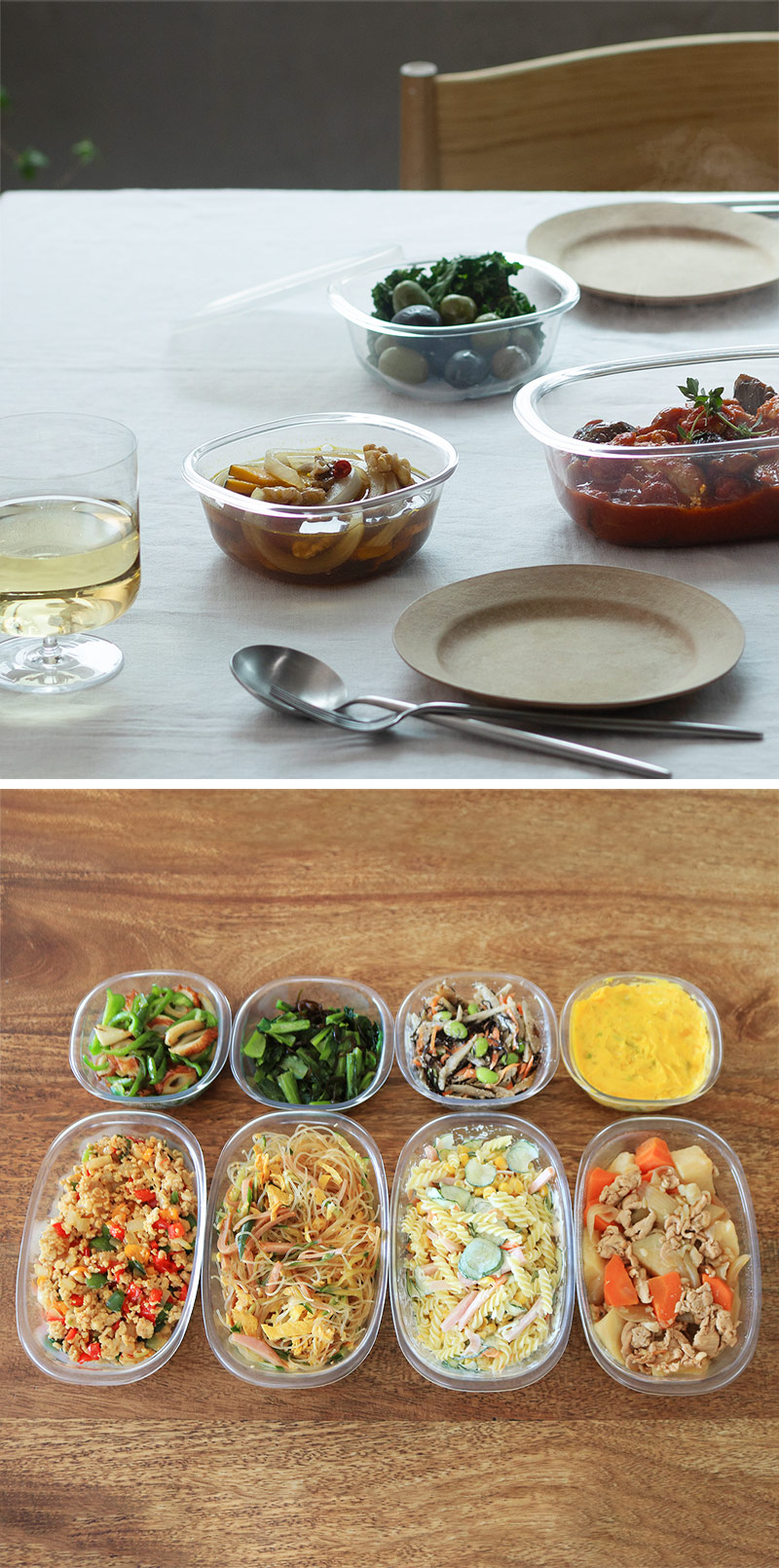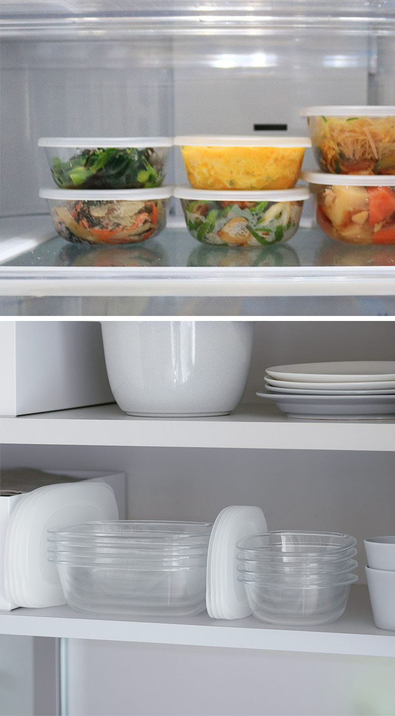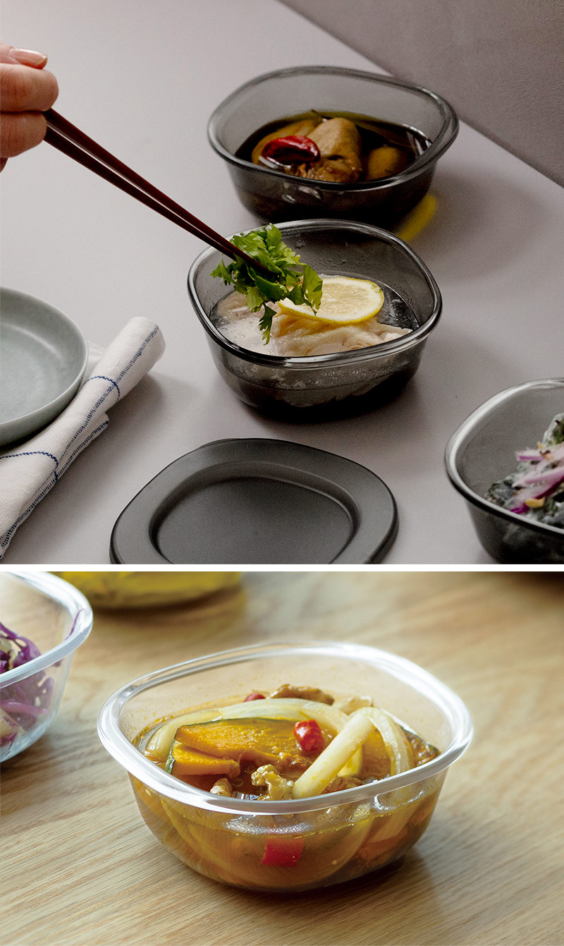 保存した作り置きおかずを、お皿に移しかえずそのままサーブしてもOK。まるでガラスのような透明感と美しいシルエットが絵になる、マーナの「うつわにもなる保存容器」。