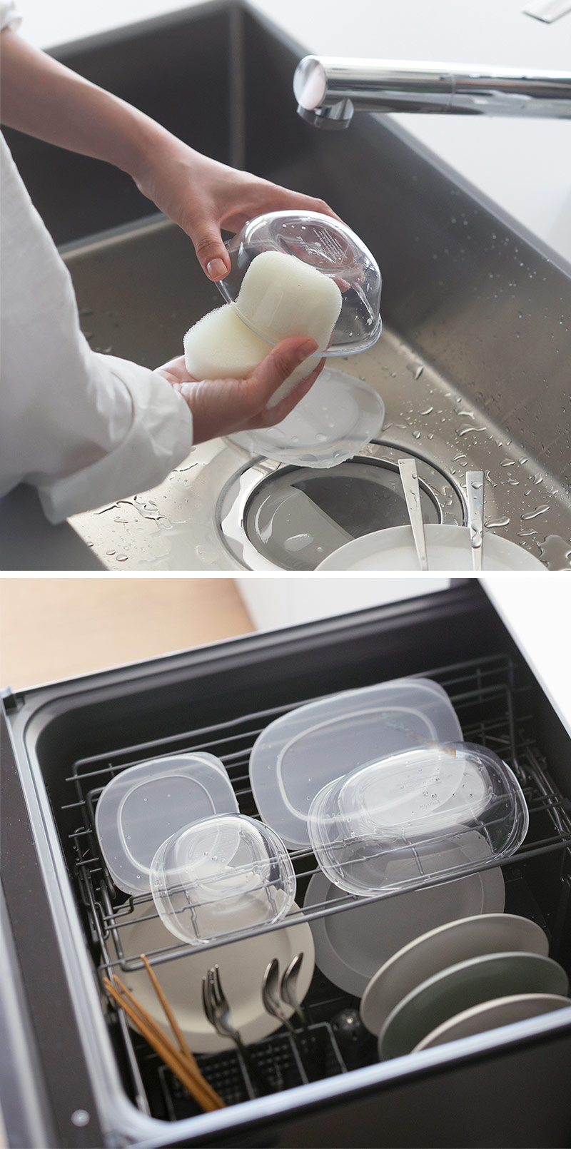 フタと容器それぞれに分けてスタッキングもできるので、食器棚でも省スペース。