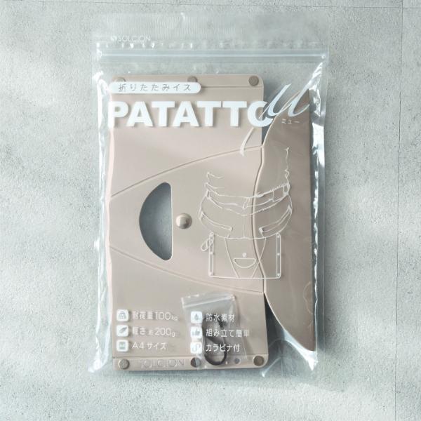- PATATTOシリーズ最小のコンパクトサイズ「パタットミュー」。折りたたむとA4以下のサイズになり、重さも約200gと軽量。カラビナで引っ掛けて持ち運びもできます。