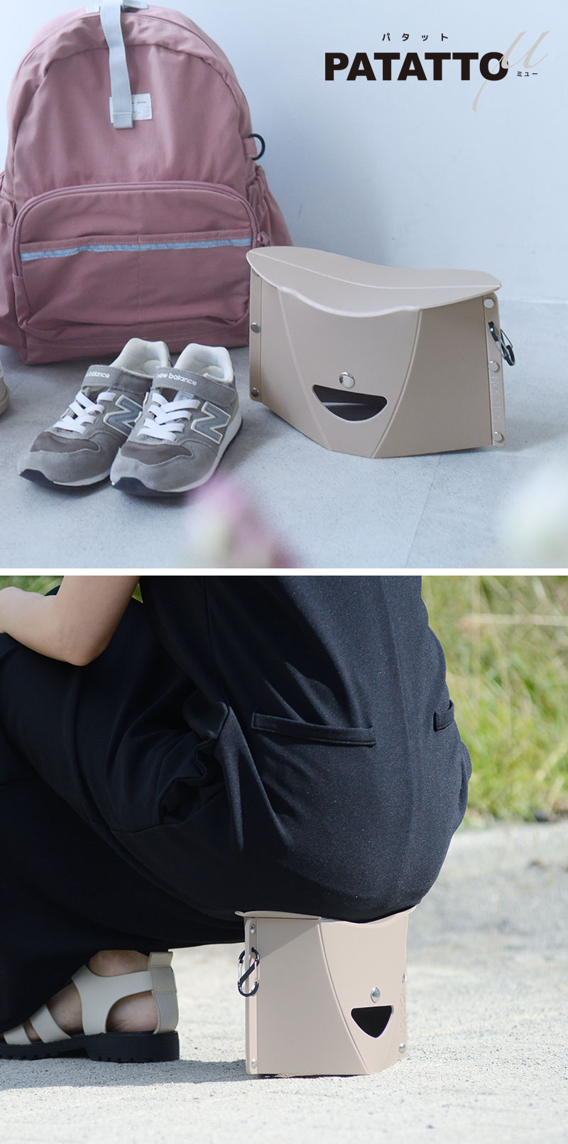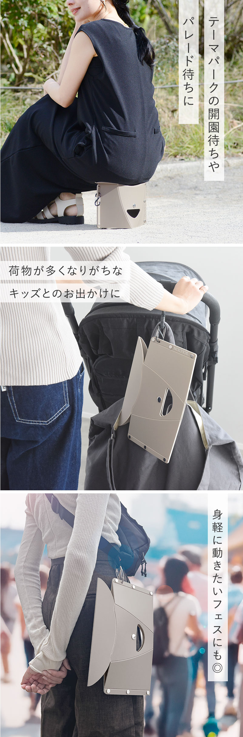 開いて押すだけでたためて、組み立ても簡単なPATATTOμ。持ち運びしやすいから、荷物が多くなりがちな子連れのお出かけ、テーマパークの開園待ちやパレード待ち、身軽に動きたいフェスなどに大活躍してくれます。