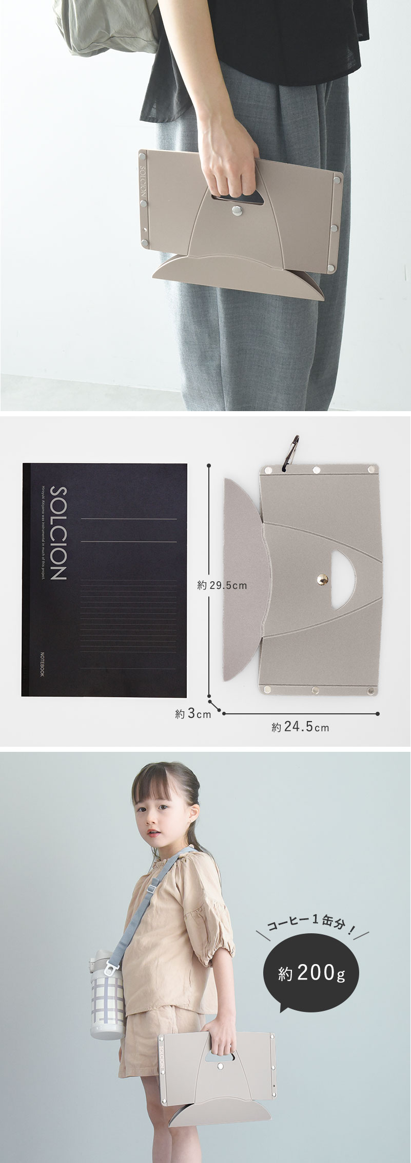 わずか約200gと軽量コンパクトA4サイズ以下のコンパクトなサイズ感と、約200gとコーヒー1缶分くらいの軽さが魅力のパタット。キッズでも持ち運びらくらくです。