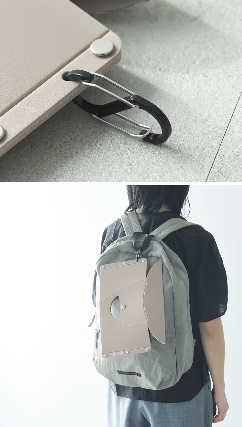 本体の穴に専用のカラビナを取り付ければ、リュックやトートバッグの外側に引っ掛けることも。フェスやテーマパークなど歩き回るシーンでも、両手をフリーにできて快適です。