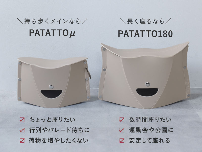 テーマパークのパレード待ちや、ライブ物販の待機列、スポーツ観戦の開園待ち、フェスなどの長時間になりがちな“待ち時間”を快適にする折りたたみ椅子「PATATTO」。