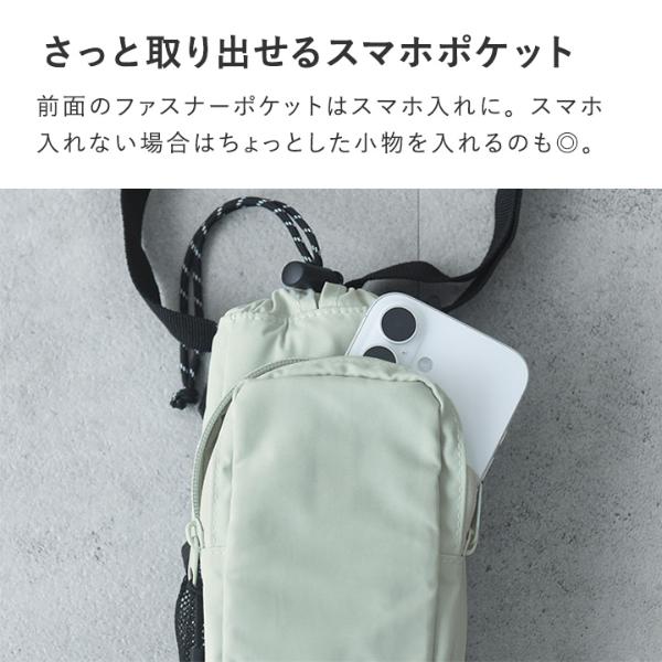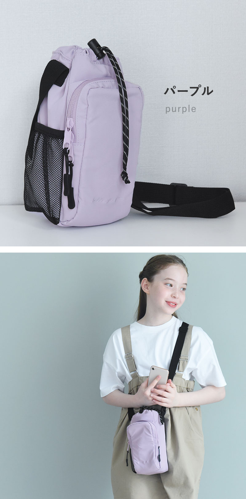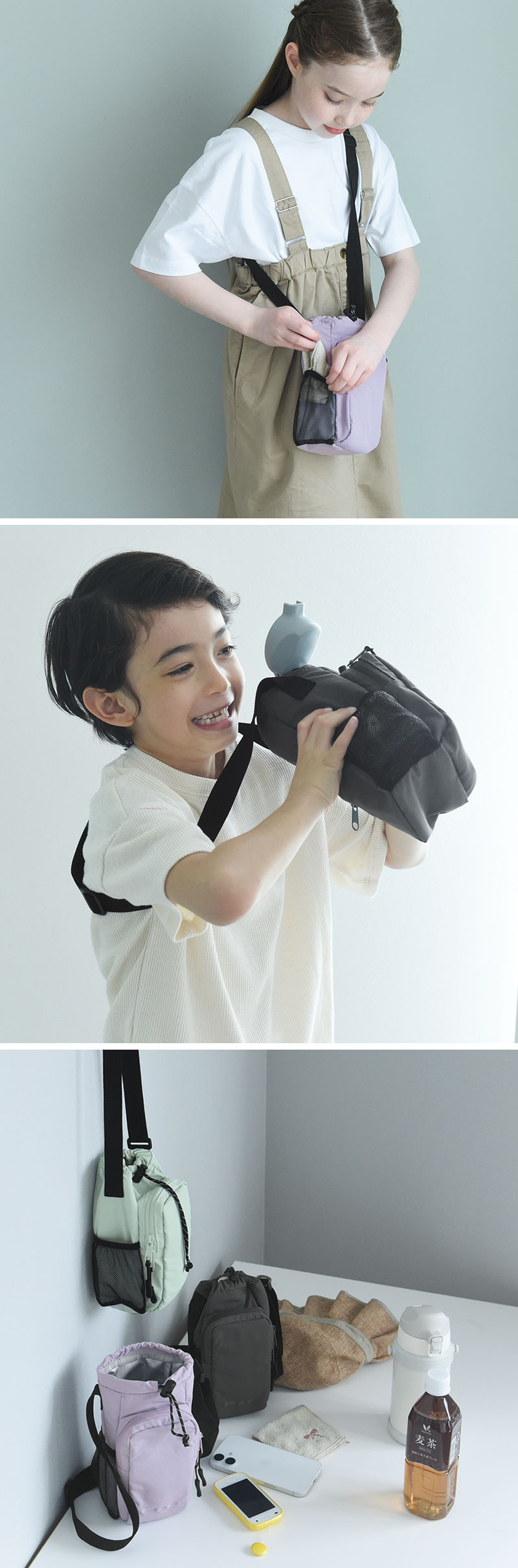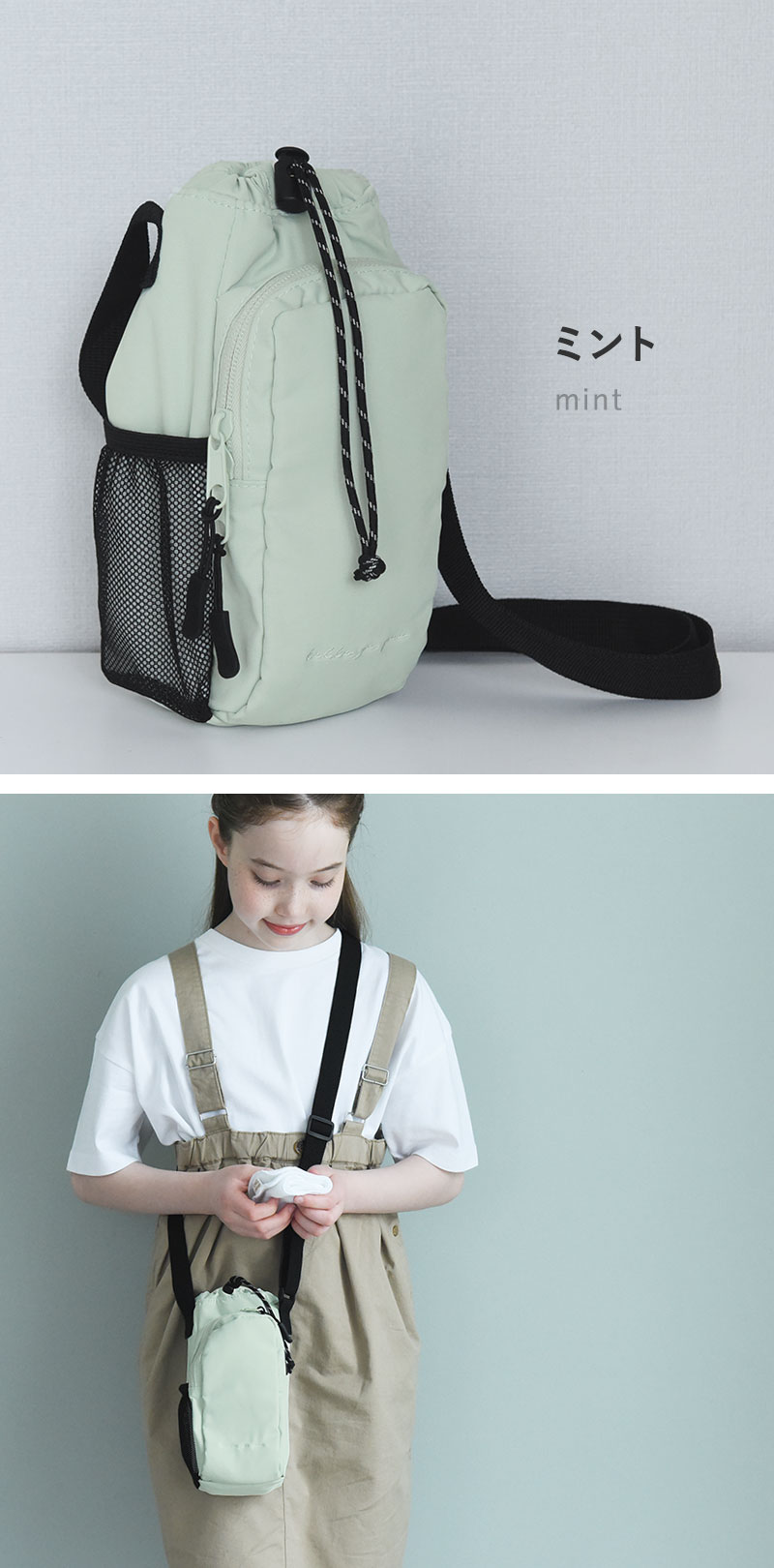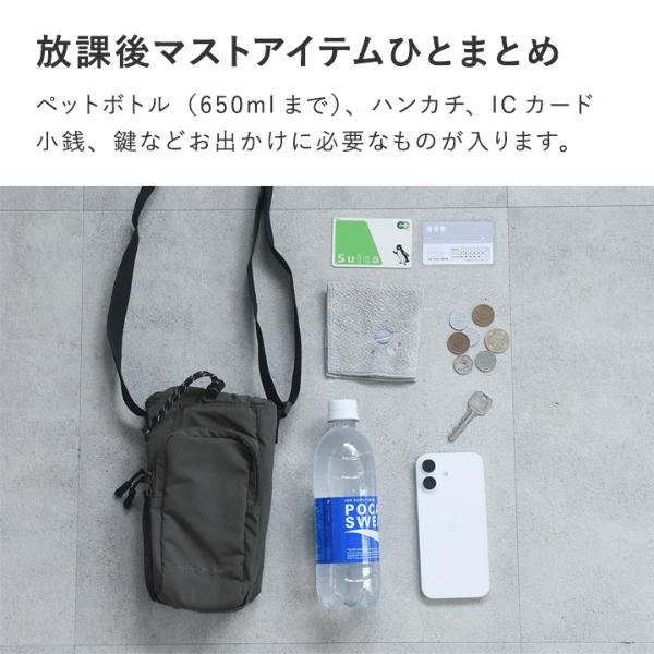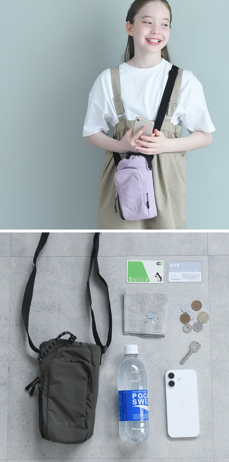水筒またはペットボトル(650mlまで)、ハンカチ、ICカード、小銭、鍵などのお出かけに必要なものがしっかりと入る、コンパクトショルダーです。