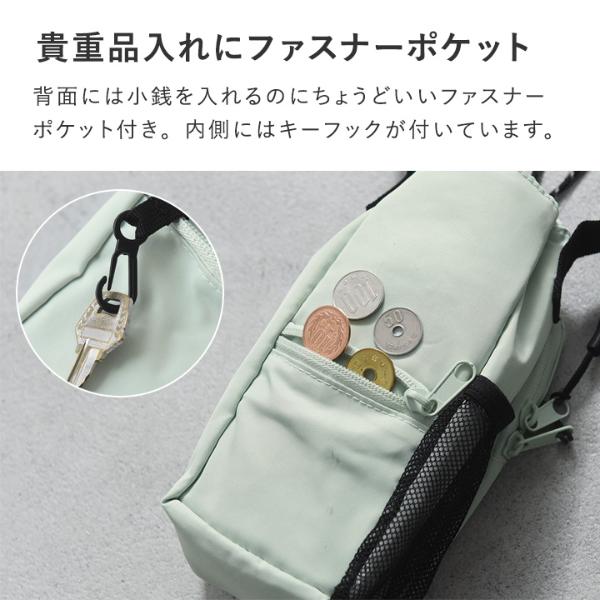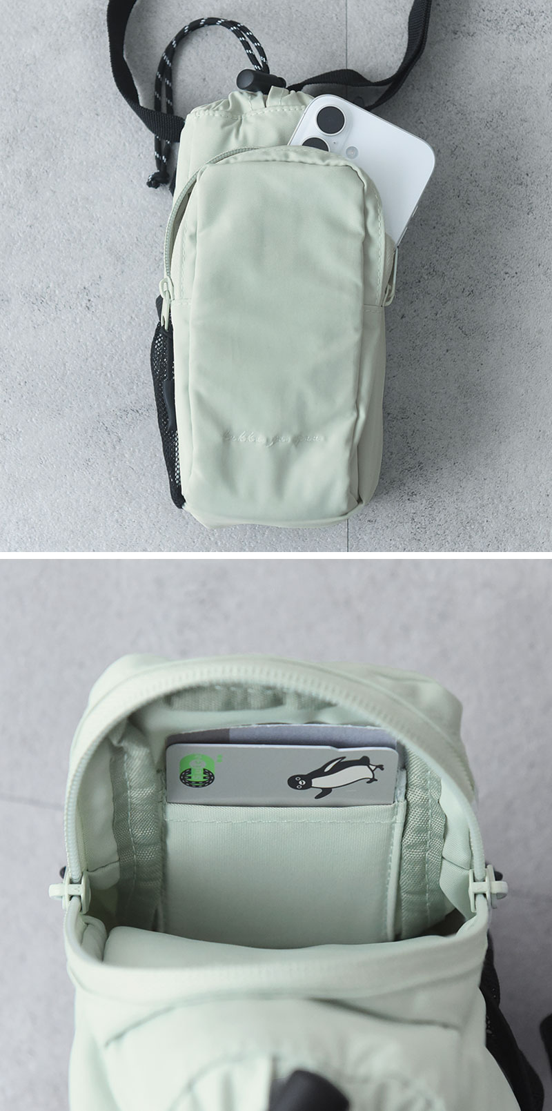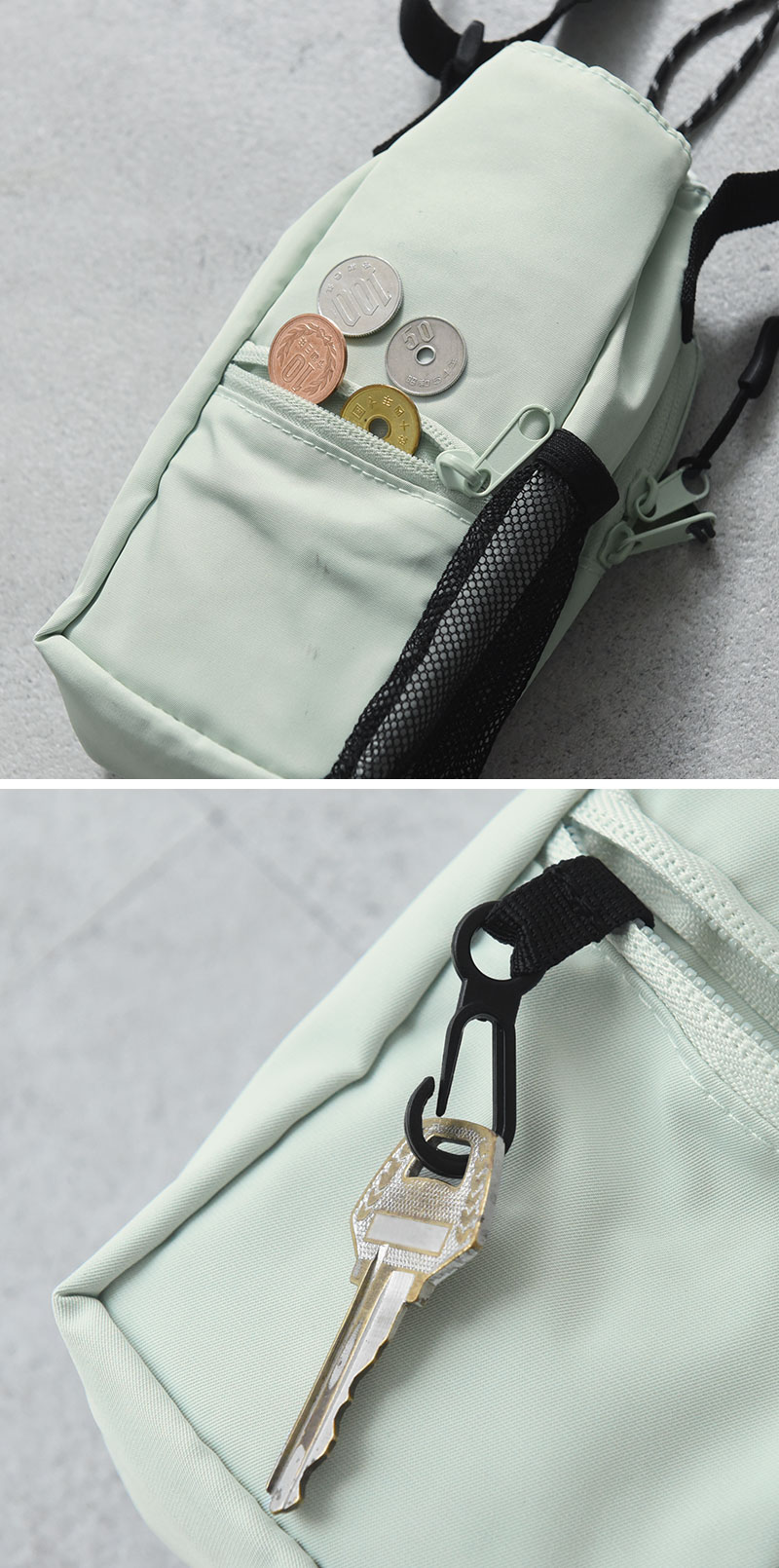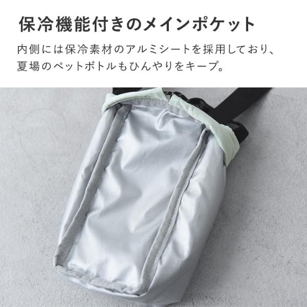 内側のメインポケットは保冷素材になっているので、暑い季節のペットボトルの持ち歩きも◎。さらに、ICカードを入れるポケットや、キーフックもつけた気遣いデザインです。