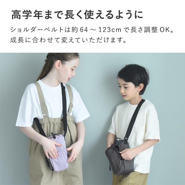 ショルダーベルトは約64~123cmで長さ調整OK。成長にあわせて変えていただけます。斜め掛けはもちろん、肩掛けもできます。