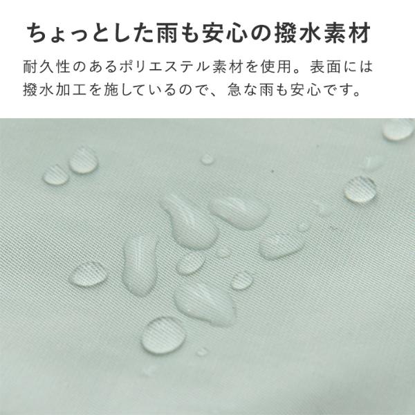 ポリエステル100%の生地は、マットで落ち着いた印象。耐久性が高く、表面は撥水加工のため、急な雨の日も弾いて安心です。